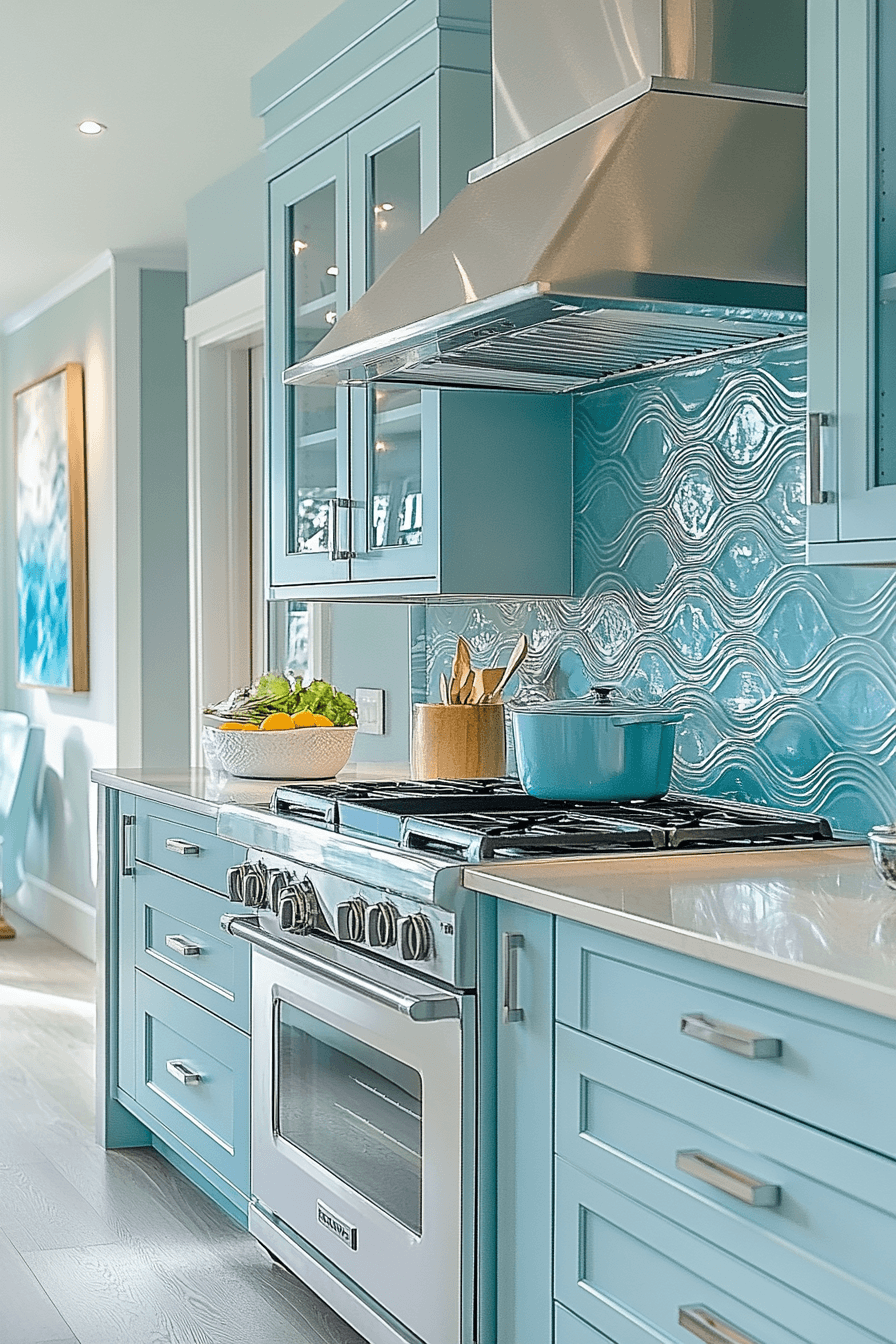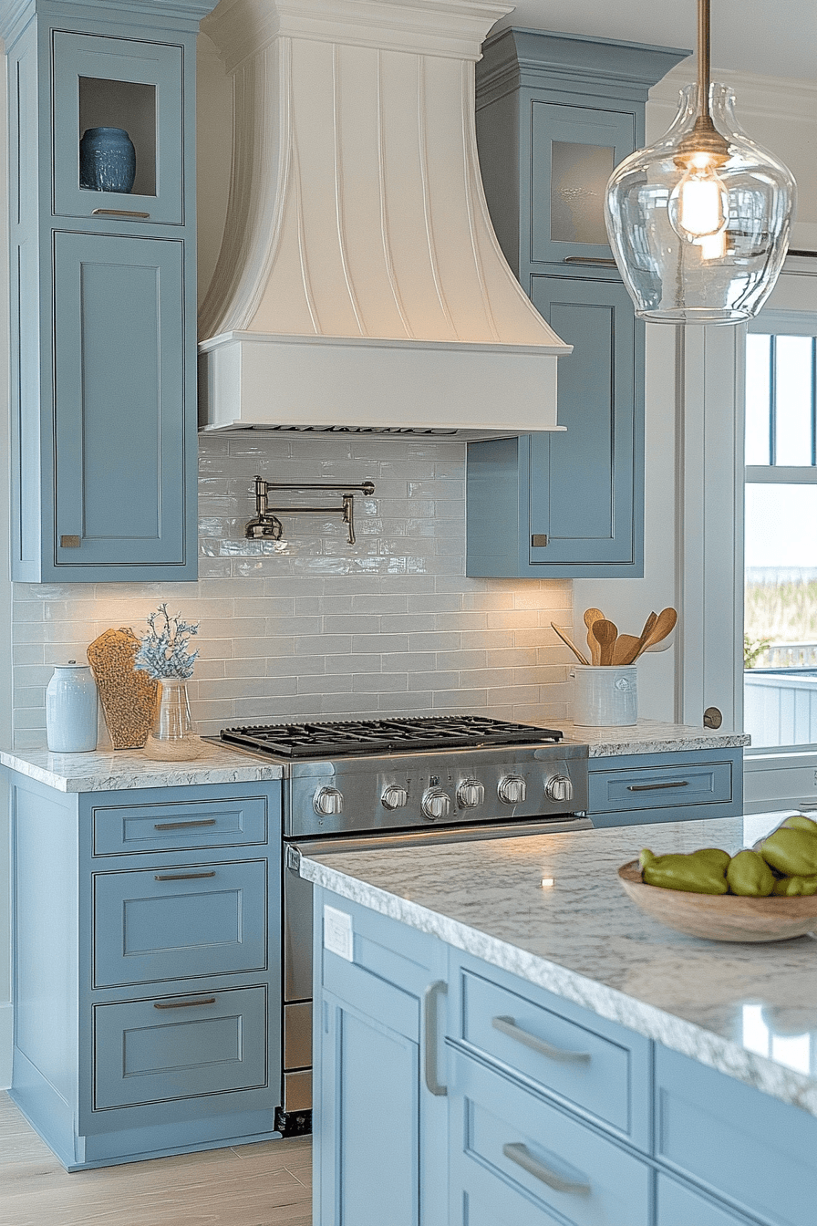 A Soft Blue Kitchen brings a calming wash of color into beach house kitchens while maintaining a clean, modern aesthetic. Powder blue cabinetry, delicate backsplash tiles, or painted accents evoke the peaceful rhythm of the sea. When paired with white countertops and light wood flooring, the palette feels airy, balanced, and visually soothing. Gentle lighting enhances the softness of the tones, creating a relaxing and inviting atmosphere. Subtle variations in texture and finish add depth without overpowering the serene design. The overall effect is tranquil, refreshing, and perfectly suited for coastal living. Tap to see how soft blues transform coastal kitchens!