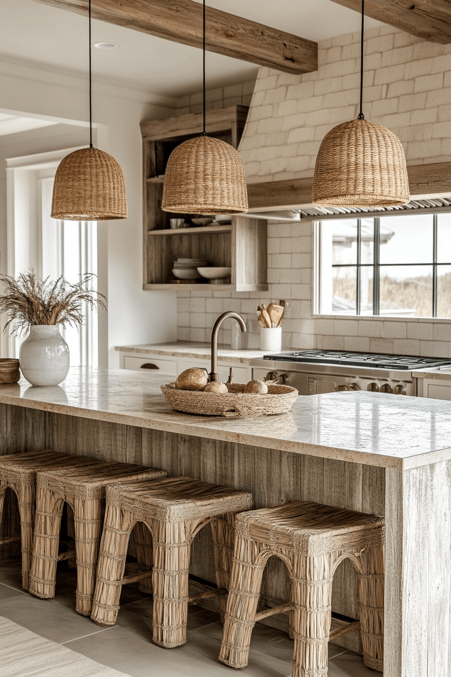 A Coastal Texture Kitchen brings depth and dimension to beach house kitchens through thoughtful layering of materials. Woven bar stools, natural wood grains, textured tiles, and linen accents all work together to create a rich yet balanced design. Neutral tones like soft whites, sandy beiges, and pale grays keep the palette cohesive while allowing textures to stand out. The mix of matte and slightly reflective finishes adds visual interest without overwhelming the space. Natural materials ground the design and reinforce the coastal connection. The result is a kitchen that feels tactile, warm, and effortlessly sophisticated. Tap to explore how texture transforms coastal kitchens!
