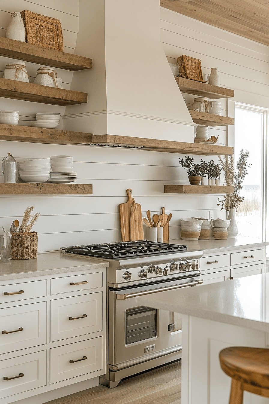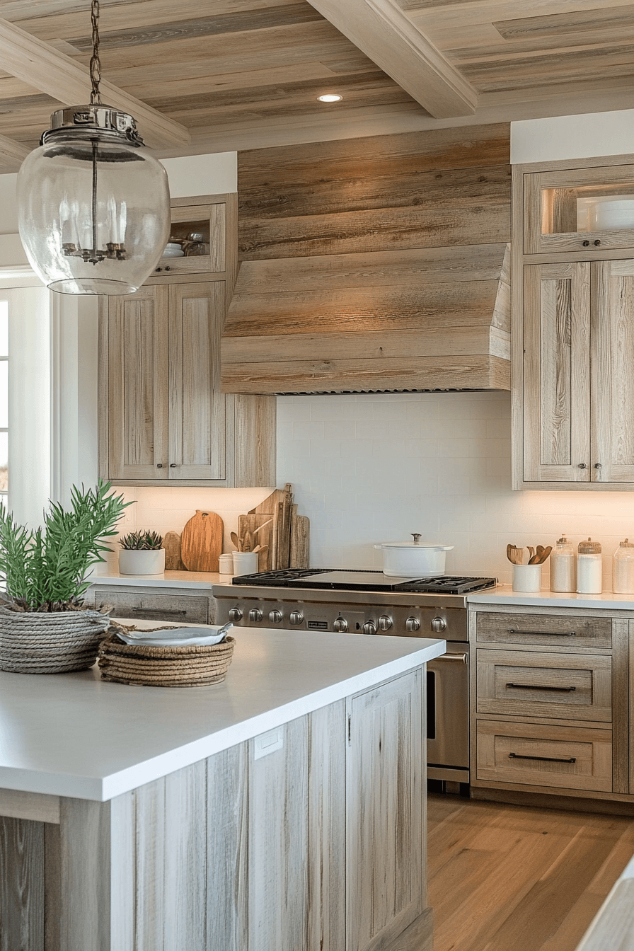 A Driftwood Style Kitchen blends rustic texture with modern elegance, making it one of the most character-rich beach house kitchens. Weathered wood finishes mimic the soft, sun-bleached look of driftwood, adding depth, warmth, and a sense of history to the space. When paired with crisp white cabinetry and light countertops, the design feels balanced and beautifully bright. Natural stone surfaces, subtle grain patterns, and soft ambient lighting enhance the organic, coastal vibe. Carefully chosen decor like ceramics, glass accents, or neutral textiles keeps the space feeling curated but never cluttered. The overall feel is relaxed, inviting, and thoughtfully designed with a strong connection to nature. Tap to get inspired by this coastal rustic fusion!