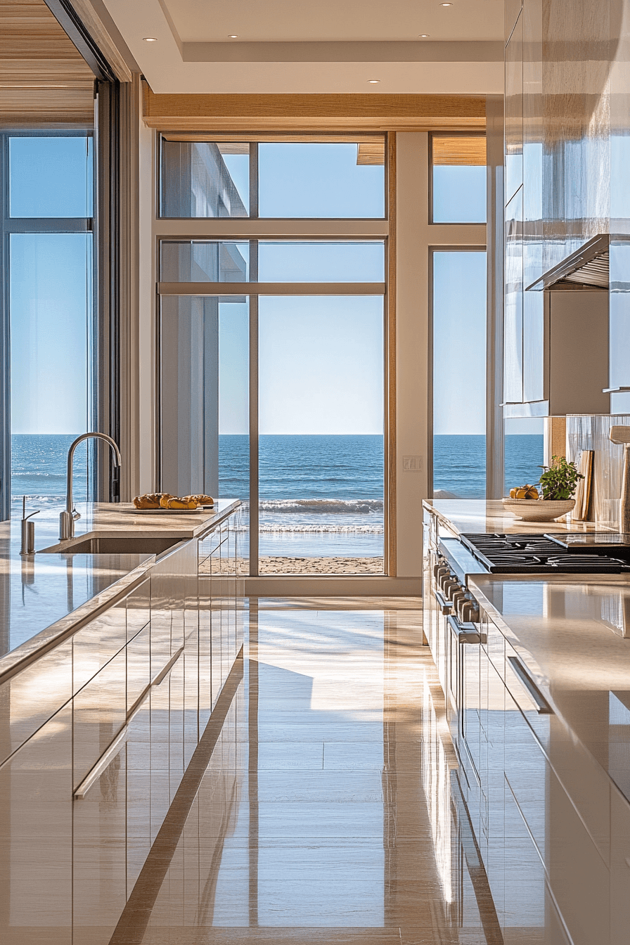 An Oceanview Modern Kitchen is all about maximizing light, openness, and scenery, making it a breathtaking choice for beach house kitchens. Expansive windows stretch across the walls, flooding the space with natural light while framing stunning ocean views as the ultimate focal point. Sleek cabinetry, glossy surfaces, and reflective finishes amplify brightness and create a seamless, high-end coastal aesthetic. Neutral tones layered with hints of ocean blue and sandy beige blur the line between indoors and outdoors. Minimalist fixtures, hidden storage, and clean silhouettes keep the design feeling uncluttered and refined. The vibe is sophisticated yet deeply connected to nature, offering a perfect balance of luxury and coastal calm. Tap to explore this elevated coastal kitchen style!