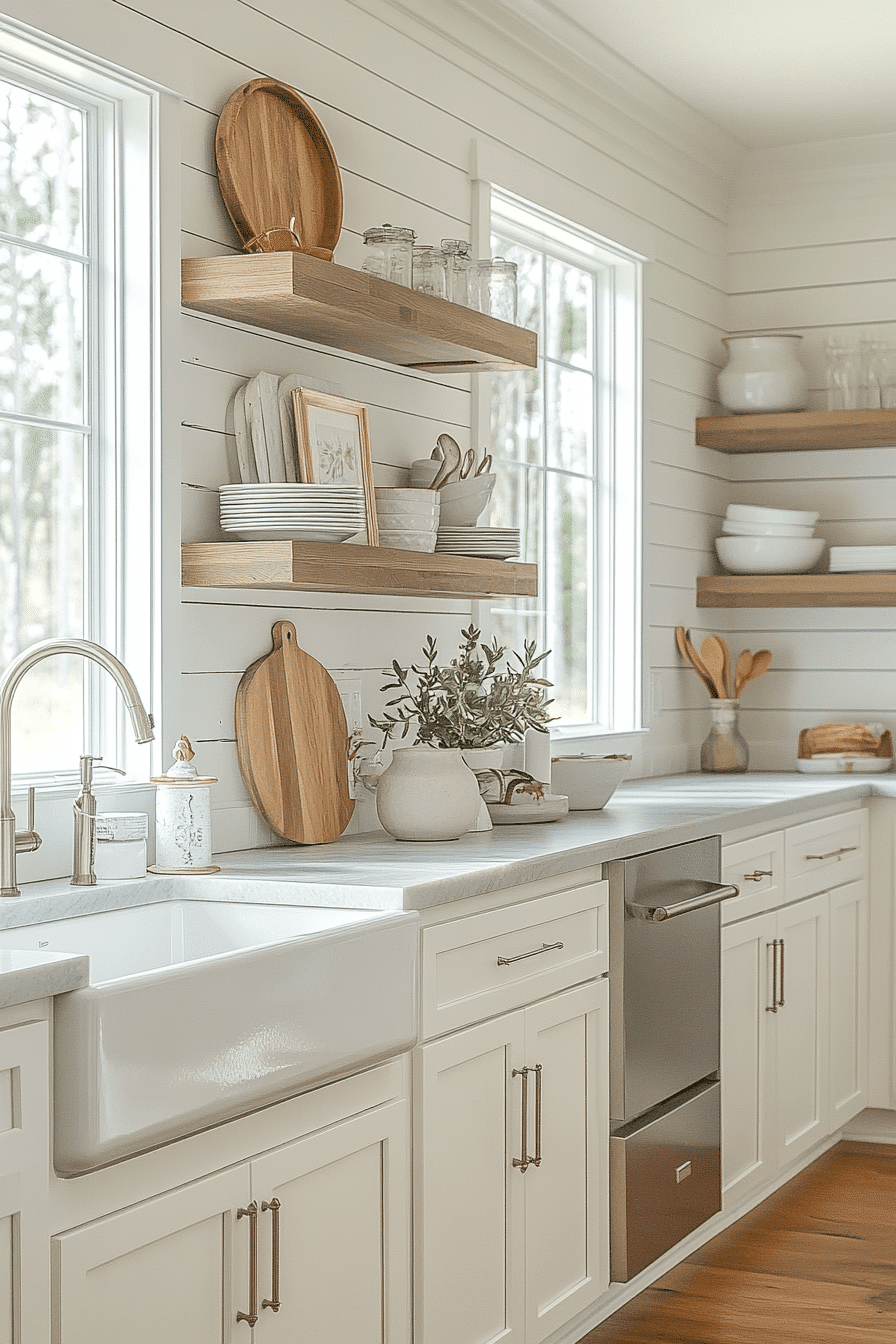 A Coastal Farmhouse Kitchen merges rustic charm with the breezy openness of beach house kitchens, creating a space that feels both cozy and fresh. Shiplap walls, apron-front sinks, and lightly weathered wood accents bring in that classic farmhouse warmth. Soft coastal colors like pale blue, creamy white, and sandy beige keep the palette bright and airy. Vintage-inspired details such as lantern-style lighting or antique hardware add character without making the space feel heavy. Open shelving and natural textures enhance the relaxed, lived-in feel that defines this style. The overall mood is warm, inviting, and timeless, perfect for creating a kitchen that feels like the heart of a coastal home. Tap to explore this farmhouse-meets-coastal style!