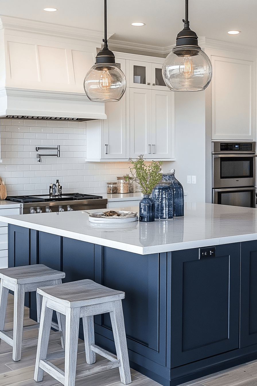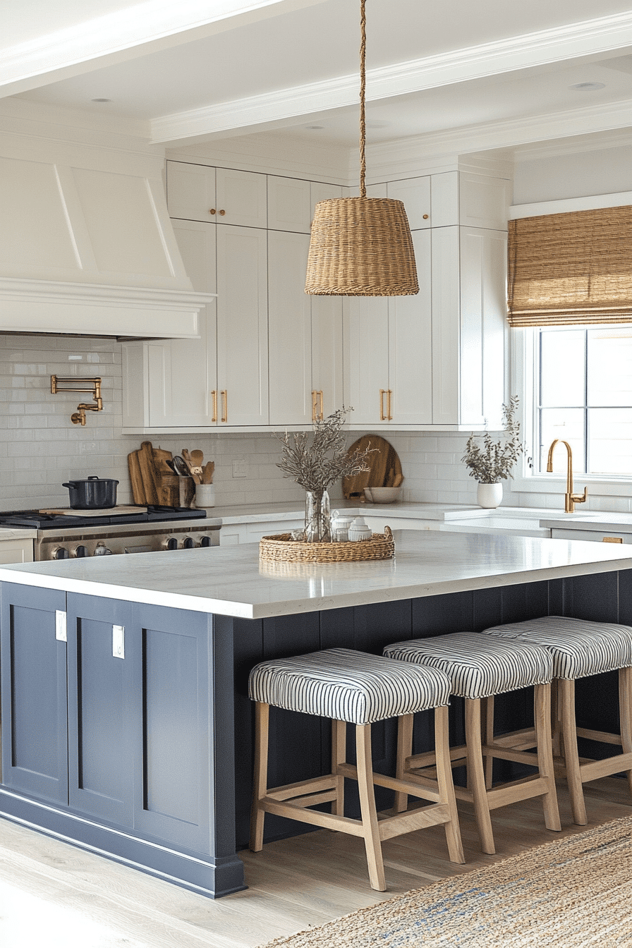 A Nautical Chic Kitchen introduces a refined maritime influence to beach house kitchens without feeling overly themed or cliché. Deep navy accents, warm brass hardware, and crisp white cabinetry create a classic palette that feels both timeless and elevated. Subtle details like thin stripes, rope textures, or nautical-inspired lighting fixtures add personality in a sophisticated way. Smooth surfaces and balanced finishes ensure the space remains polished and cohesive. The contrast between dark and light tones adds depth while maintaining a clean, modern feel. The mood is stylish, slightly playful, and rooted in coastal tradition with a fresh twist. Click to explore this polished nautical aesthetic!