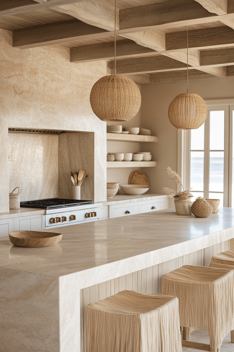 A Soft Sand Kitchen creates a warm and comforting foundation for beach house kitchens through a palette inspired by sunlit shores. Beige tones, creamy whites, and light wood finishes blend seamlessly to form a soothing and cohesive environment. Natural materials like stone countertops and subtle wood grains add quiet texture and visual depth. Soft, diffused lighting enhances the warm hues, giving the space a gentle, glowing ambiance throughout the day. Linen accents, woven details, and matte finishes contribute to a layered yet uncluttered look. The atmosphere feels calm, grounded, and welcoming, like stepping into a peaceful coastal retreat. Discover how to recreate this sand-inspired kitchen design!