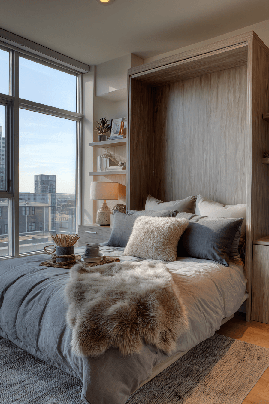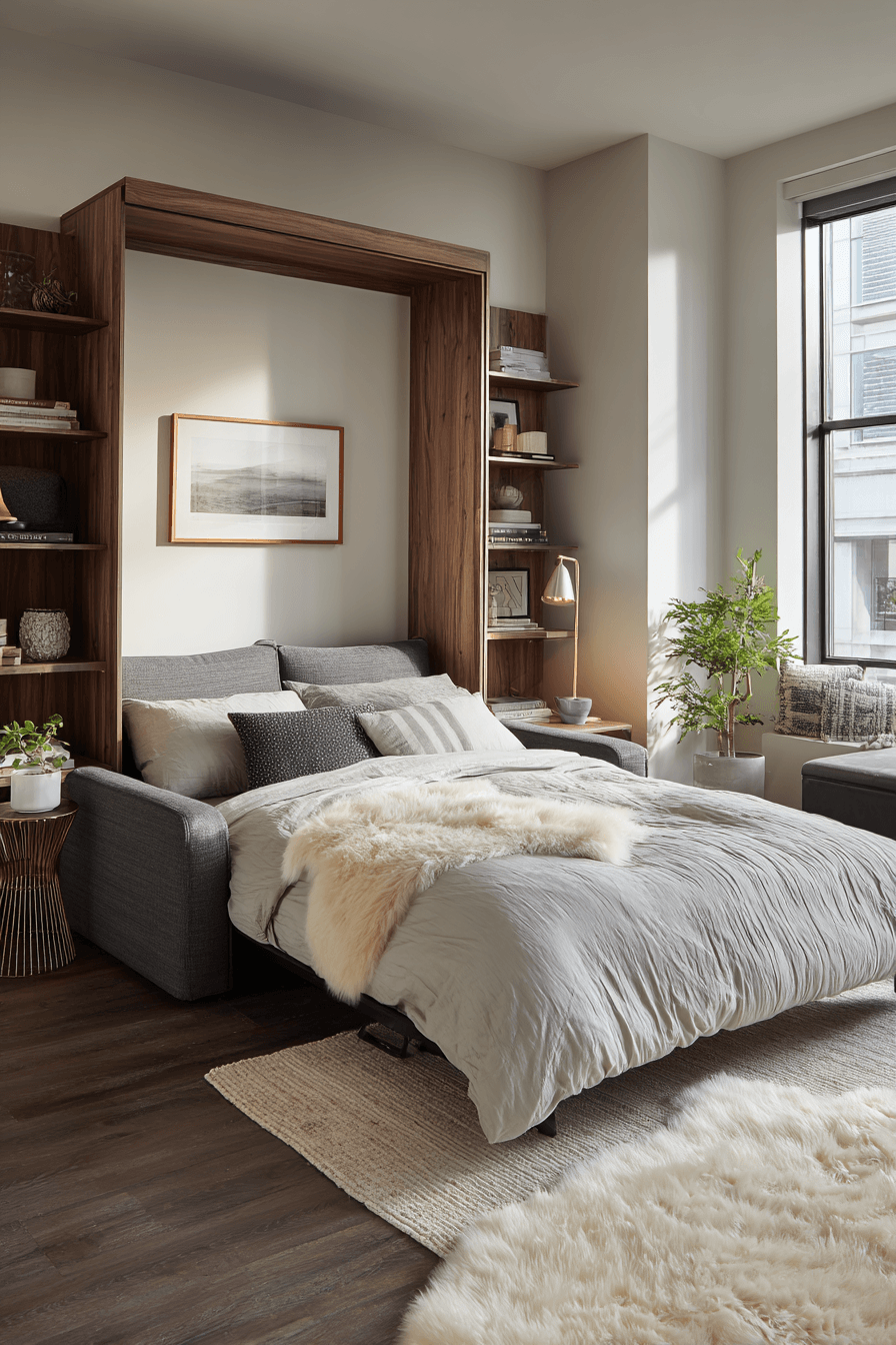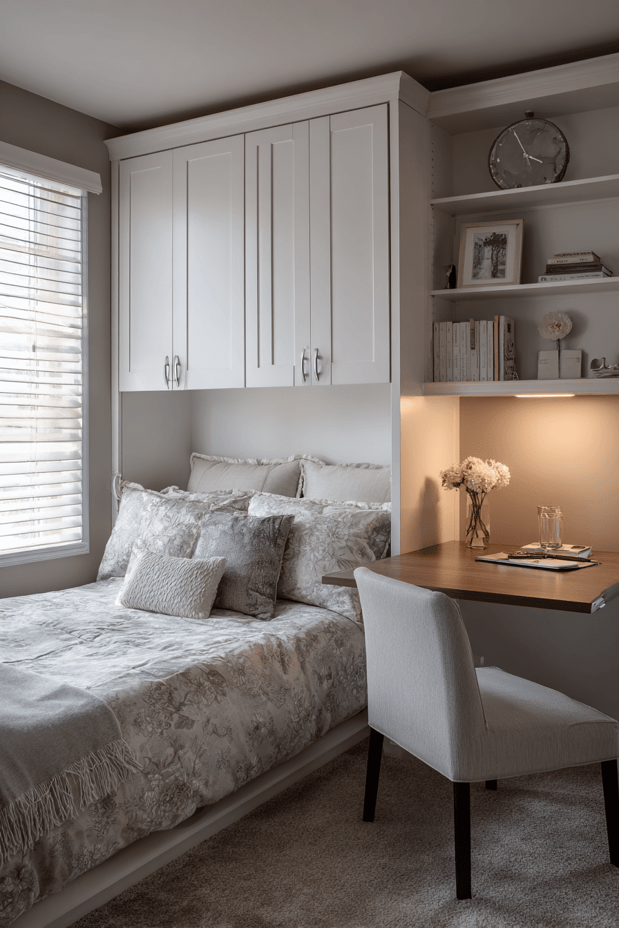 Maximizing flexibility becomes effortless with hidden bed solutions, a standout feature in bedroom ideas for small rooms. Wall beds or convertible designs allow you to reclaim floor space during the day for work or relaxation. This setup is especially useful in studio layouts or multi-use rooms. It keeps the space functional without sacrificing comfort or style. Discover more space-saving bed ideas today!