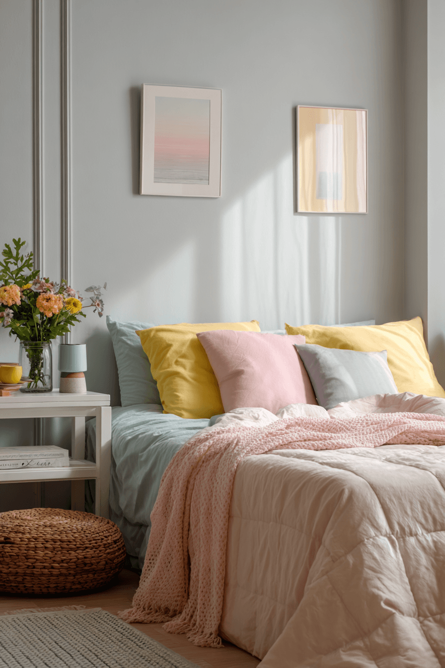 Soft pastel tones introduce a calming and airy vibe that works beautifully within bedroom ideas for small rooms. Gentle hues like blush pink, light blue, and buttery yellow reflect light and make the space feel more expansive. These colors create a peaceful atmosphere perfect for unwinding. They also add charm without overwhelming the room’s design. Click to uncover more pastel styling ideas!