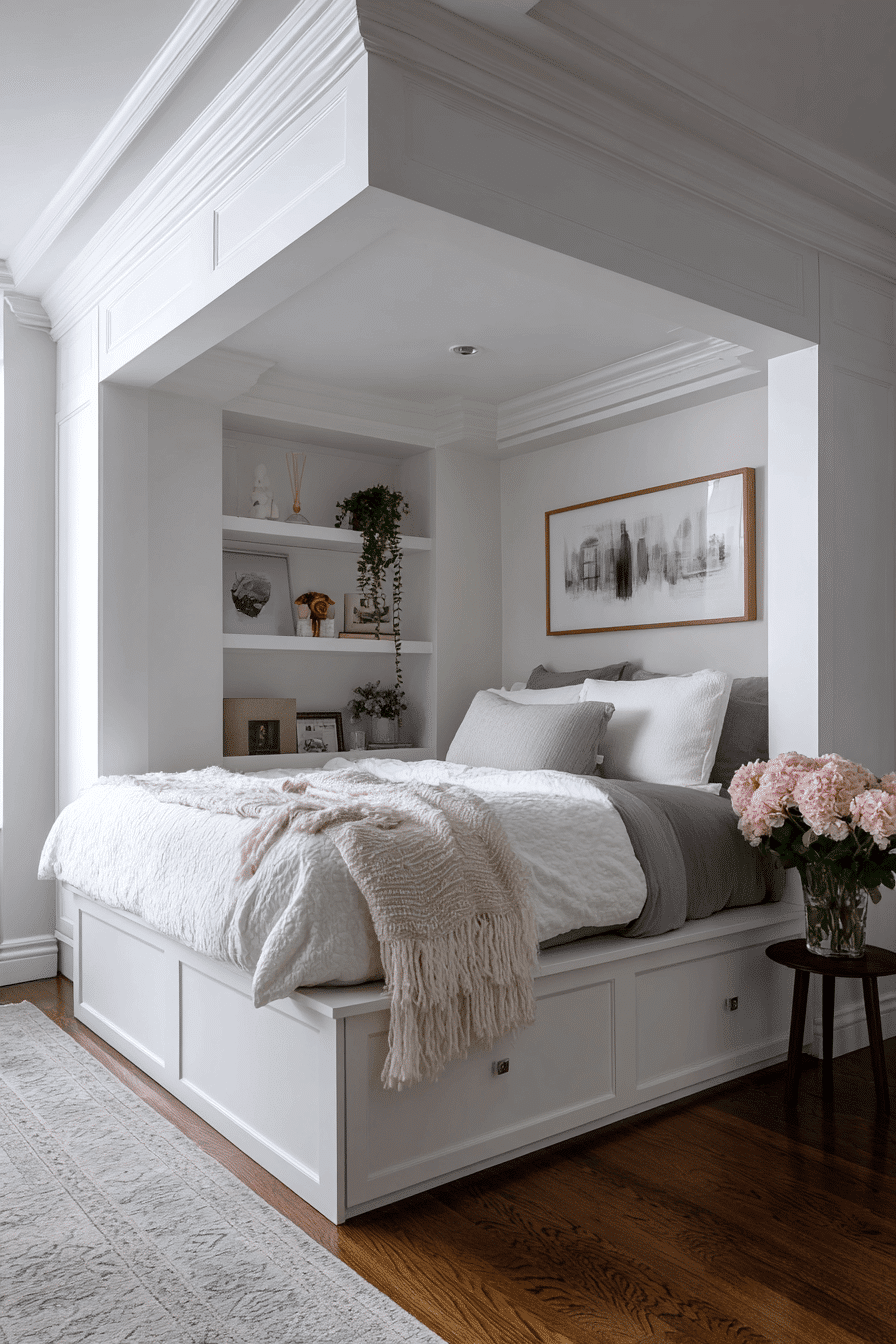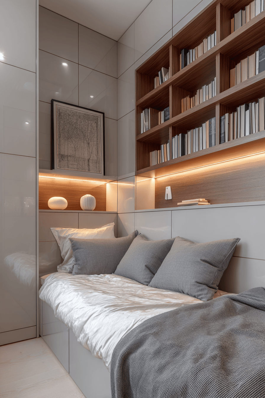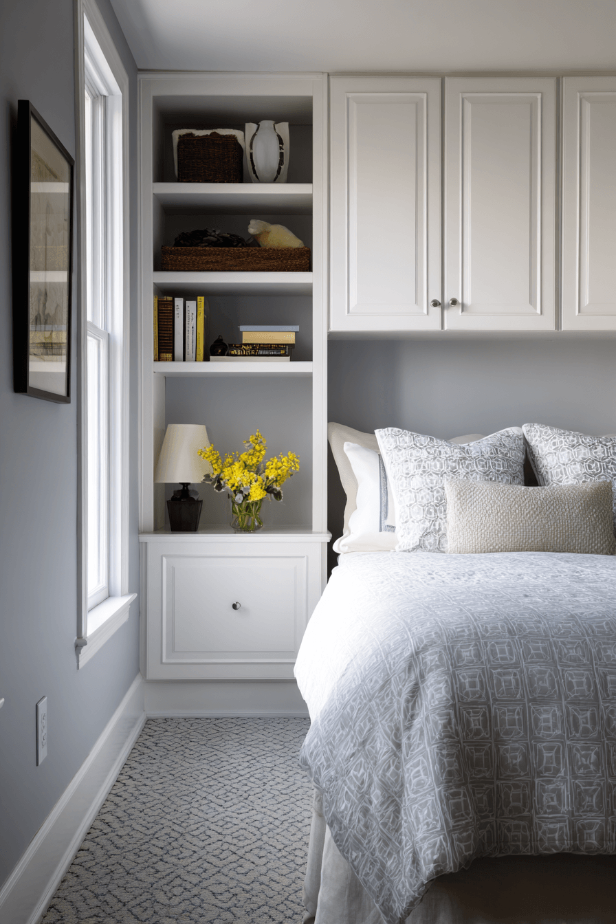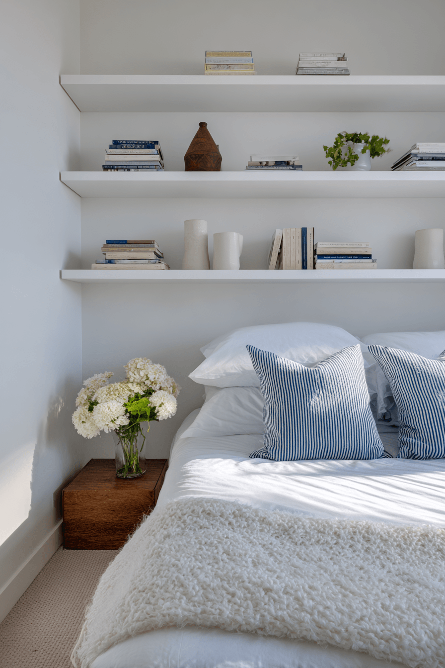 Blending storage seamlessly into the design can make a huge difference, especially when working with bedroom ideas for small rooms. Sleek shelving that matches the wall color keeps essentials within reach while maintaining a clean, uncluttered look. Placing shelves thoughtfully ensures functionality without overwhelming the space. This modern approach helps the room feel open and organized. Browse more streamlined shelving ideas today!