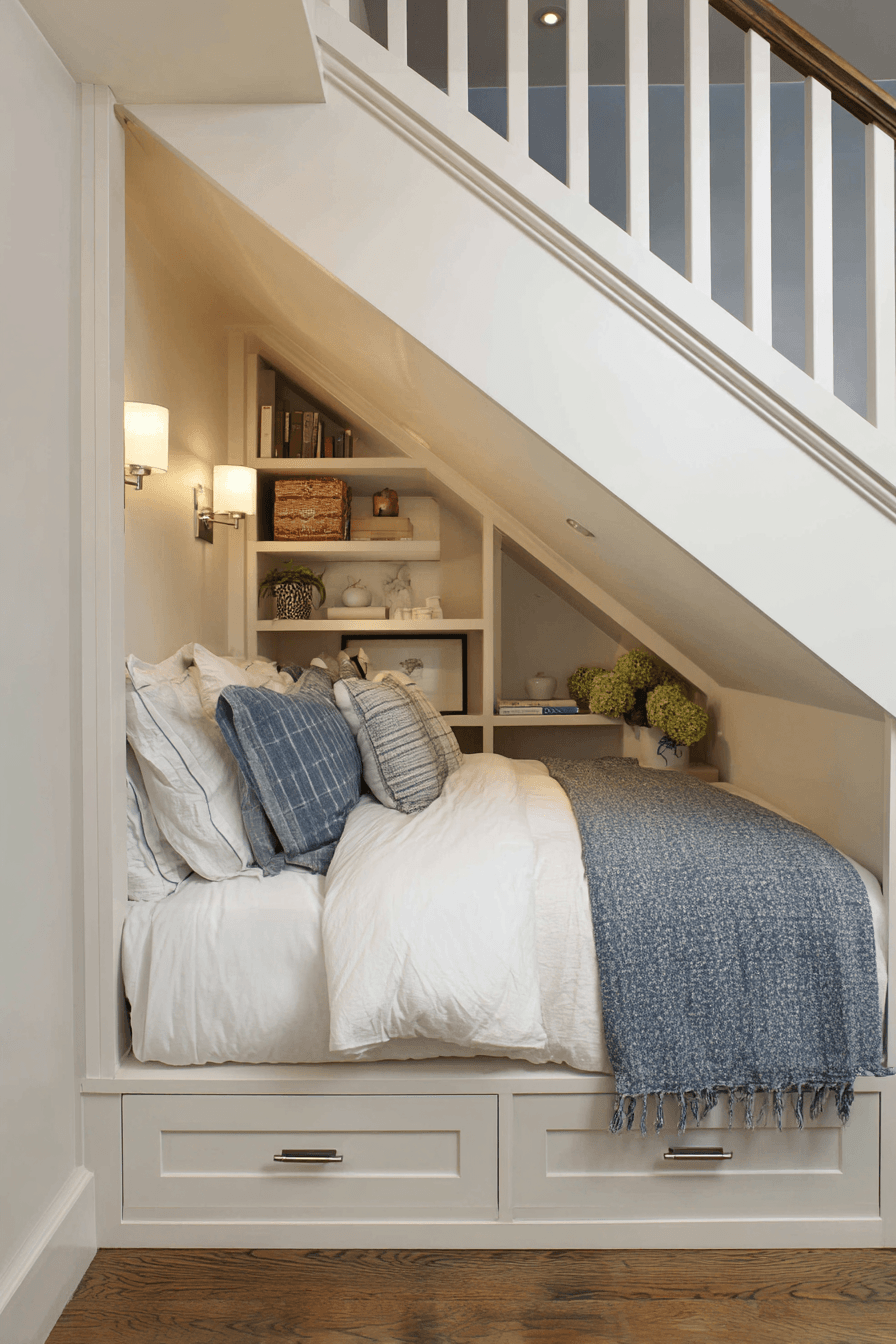 Unused spaces can become standout features with a little creativity, making under-stair designs perfect for bedroom ideas for small rooms. Transforming this area into a cozy sleeping nook or reading retreat adds charm and practicality. It’s an ideal solution for compact homes where every inch counts. This clever setup blends comfort with efficiency beautifully. Discover more under-stair transformations now!