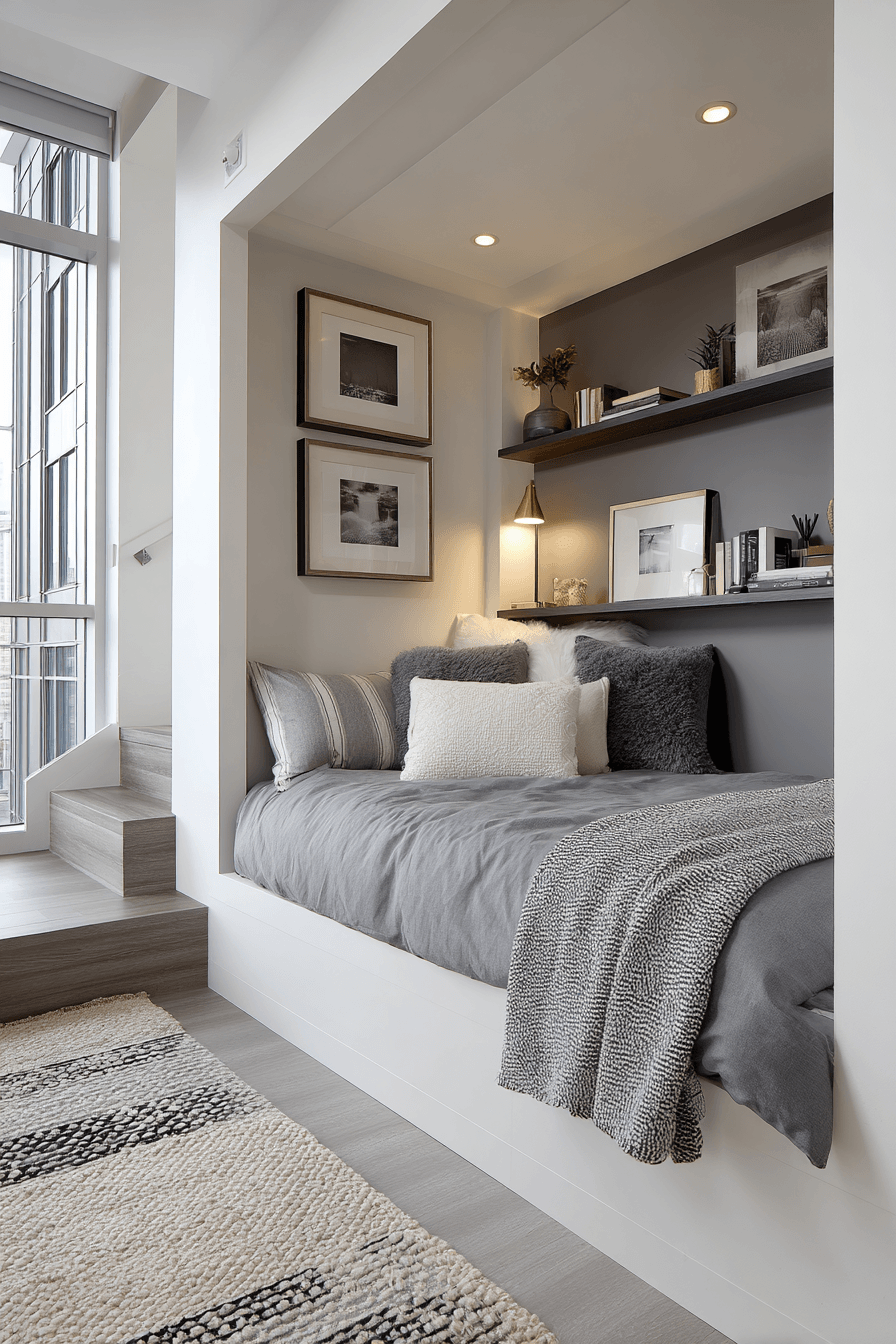 Give your space a bold, contemporary edge by incorporating a modern loft feel into your bedroom ideas for small rooms. Think sleek furniture, contrasting tones, and smart use of vertical space like elevated beds. Subtle industrial accents add personality without overcrowding the design. This look is ideal for creating an energetic and stylish atmosphere. Tap to get inspired by more loft designs!