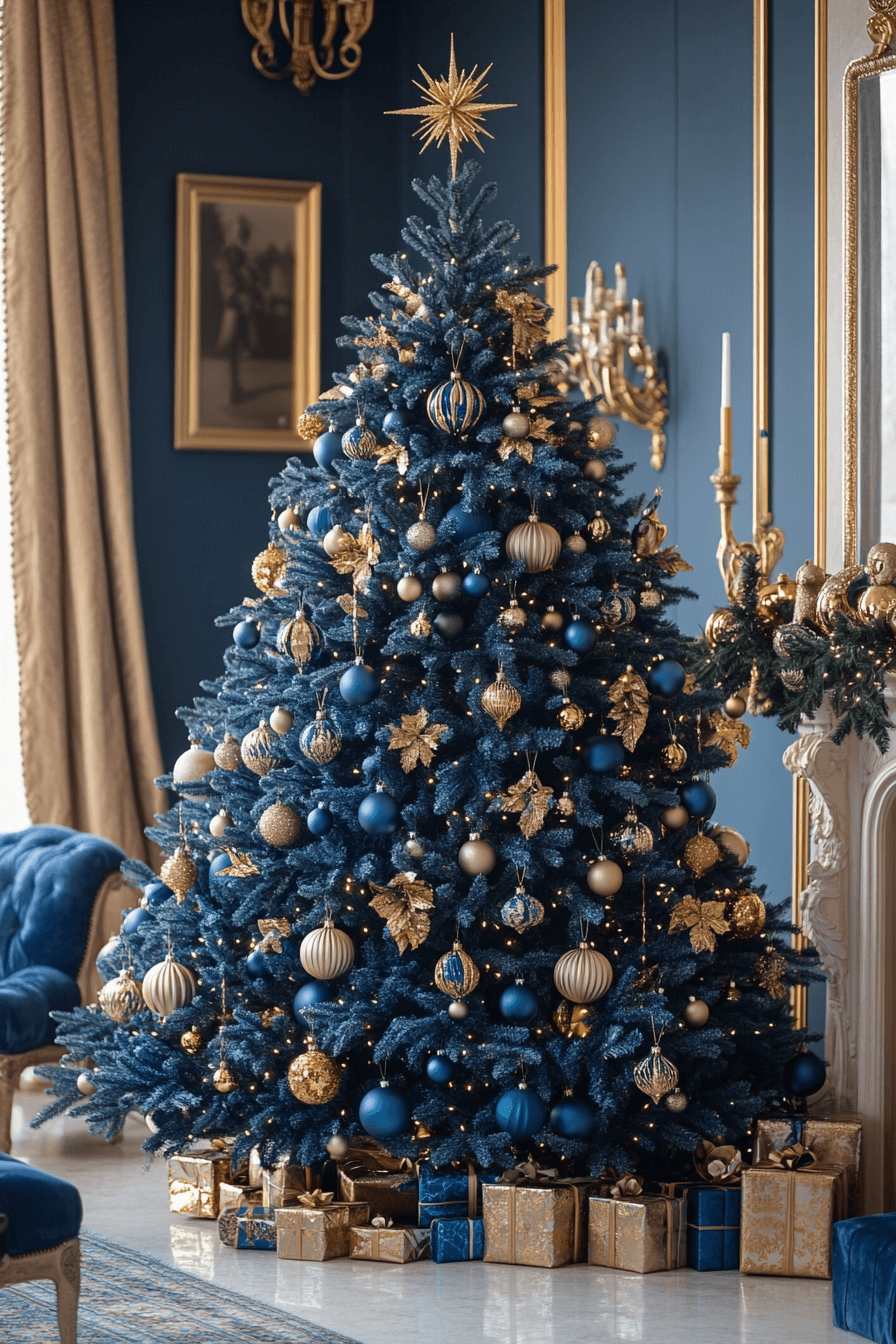 A luxurious blue Christmas tree shines with royal blue ornaments and golden lights for an opulent finish. The mix of deep blue and glimmering gold creates a showstopping look that’s timeless yet trendy. This setup works beautifully in both grand and cozy spaces. These blue Christmas decor ideas bring upscale magic to your home.