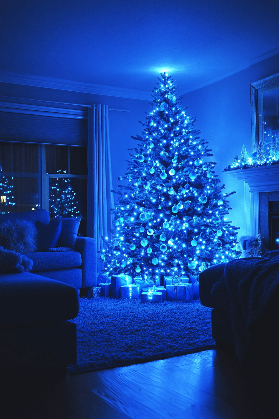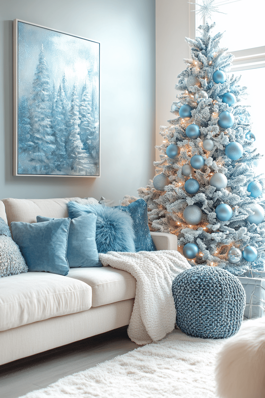 Soft blues and whites bring a gentle coastal charm to your holiday living room, creating a breezy and peaceful retreat. Pair light blue accents with organic textures like woven baskets and driftwood for that beachy touch. A frosted tree adorned with silver and pale blue ornaments completes the scene with a tranquil vibe. These blue Christmas decor ideas make it easy to bring serene ocean-inspired beauty into your holiday home.