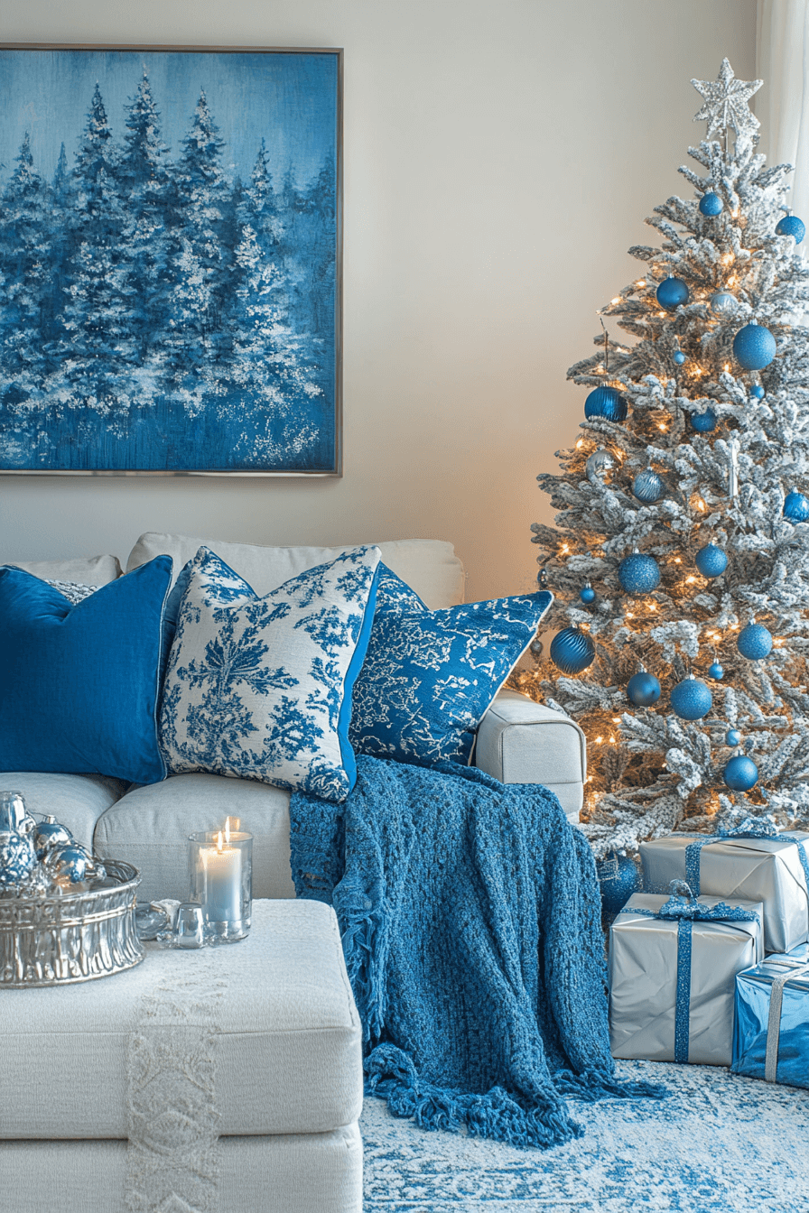 Create a regal and cozy atmosphere with a lounge that blends royal blue tones with soft silvers. Layer in blue throws, plush pillows, and a tree adorned with glamorous blue and silver ornaments for a luxurious holiday vibe. Sparkling lights add warmth and depth to the look. These blue Christmas decor ideas bring sophistication and comfort to your festive season.