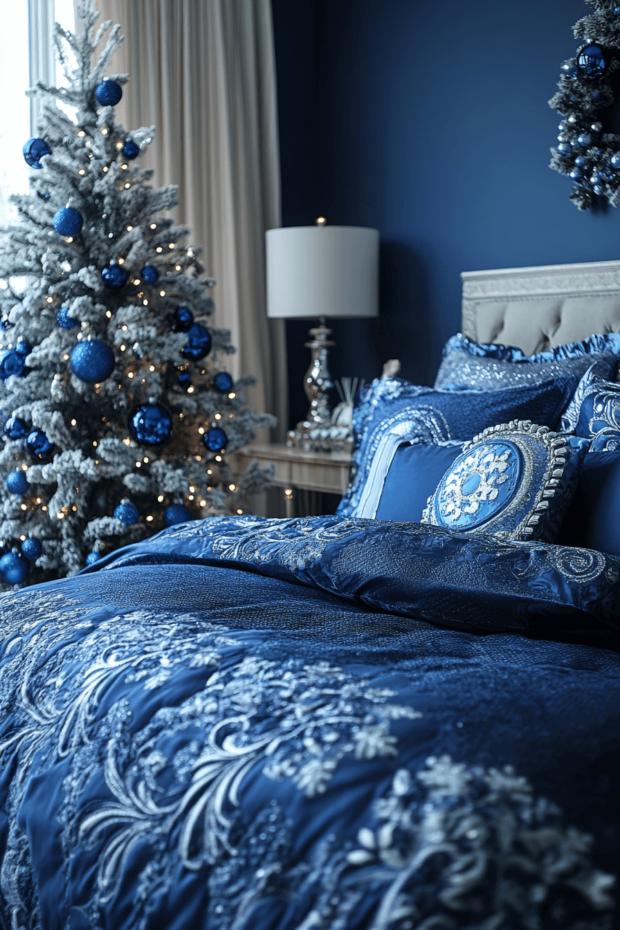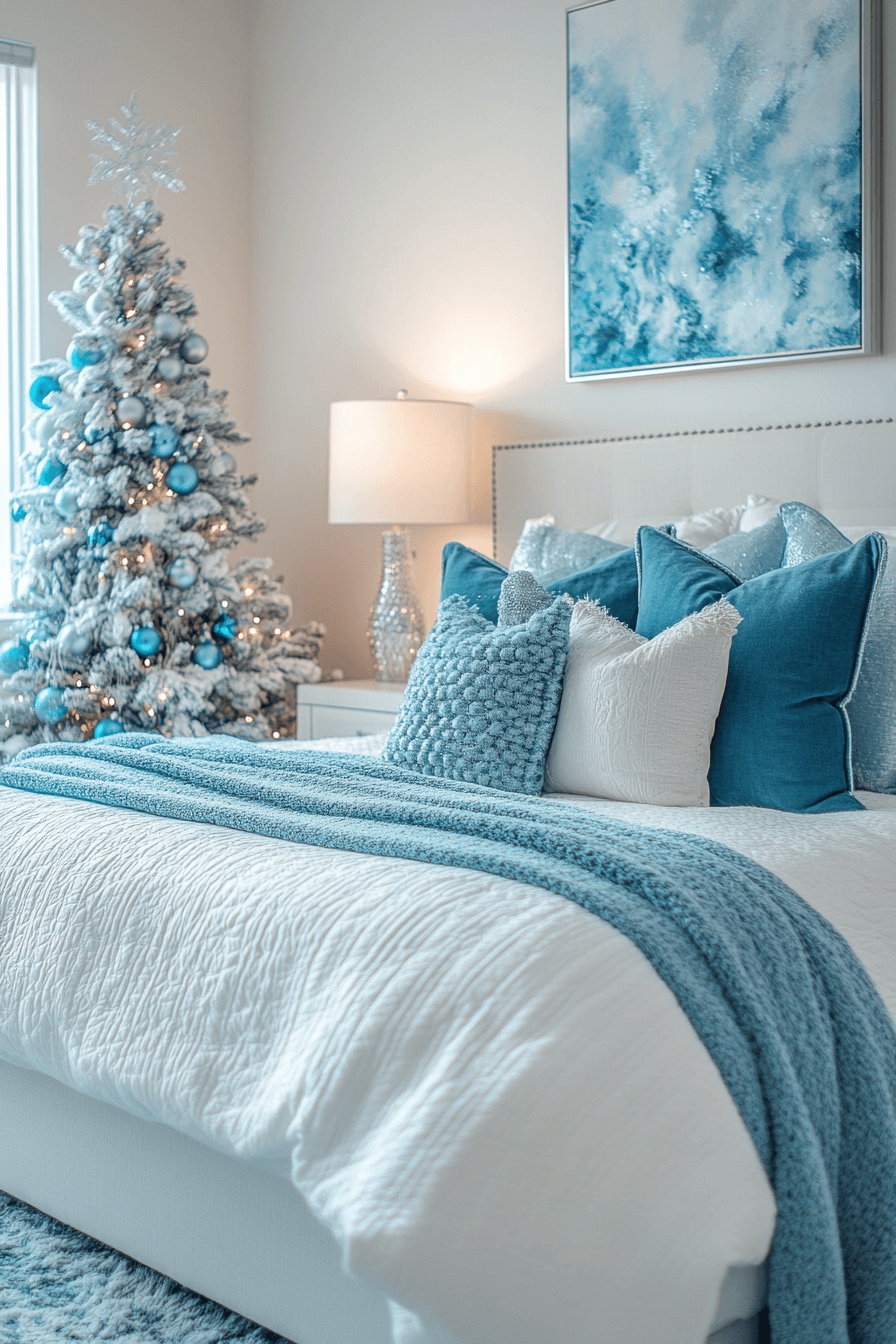 Craft a peaceful retreat with blue Christmas decor ideas in your bedroom that feel like a holiday escape. Soft blue duvets, silver decor, and subtle lighting create a soothing winter vibe. Add frosted accents on windows or a mini blue tree for a festive touch. This cozy setup invites rest and celebration all in one.