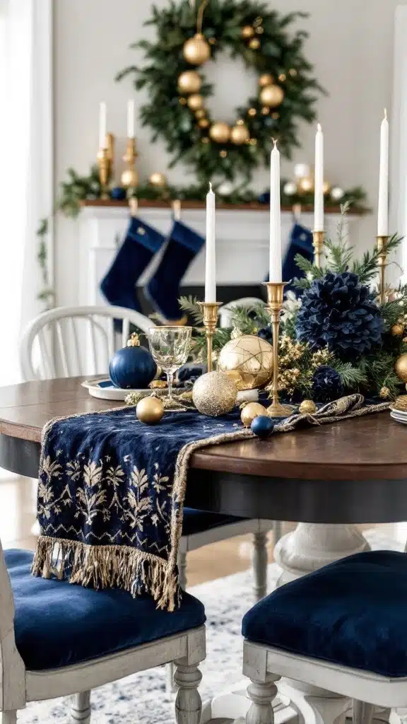 Elegant Navy and Gold Accents create a luxurious and refined ambiance in your home. The deep navy provides a grounding, calming effect, while shimmering gold adds warmth and a sense of opulence. Velvet textures, gold-tipped ornaments, and sleek metallic candleholders weave together a timeless holiday aesthetic.