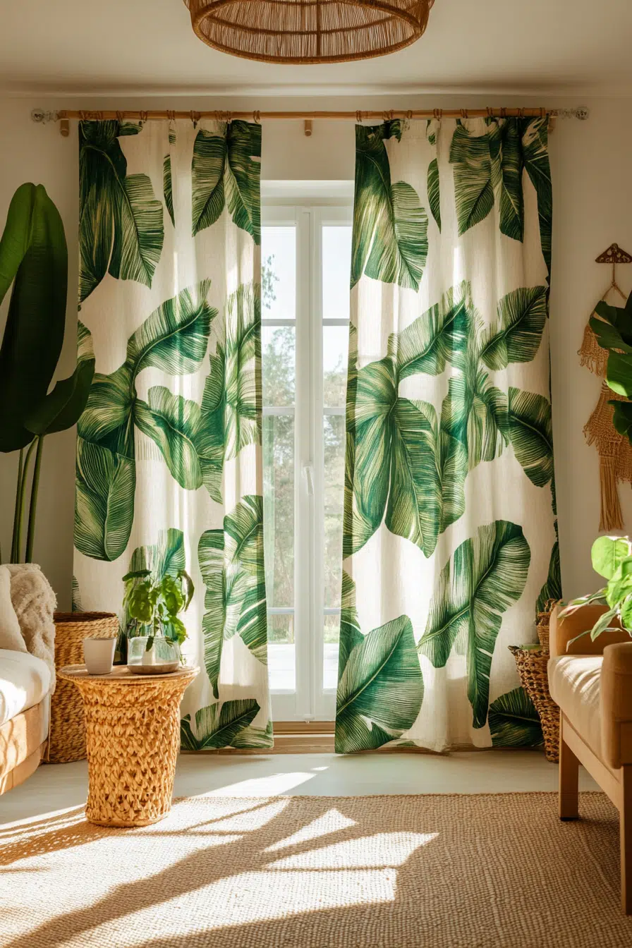Inject a burst of green into your space with boho window treatments featuring Tropical Leaf Patterns. These designs bring a fresh, natural ambiance that’s perfect for a calm retreat. They blend effortlessly with wicker or wood, enhancing the boho vibe. These treatments are ideal for those looking to bring the outside in with a light, airy touch.