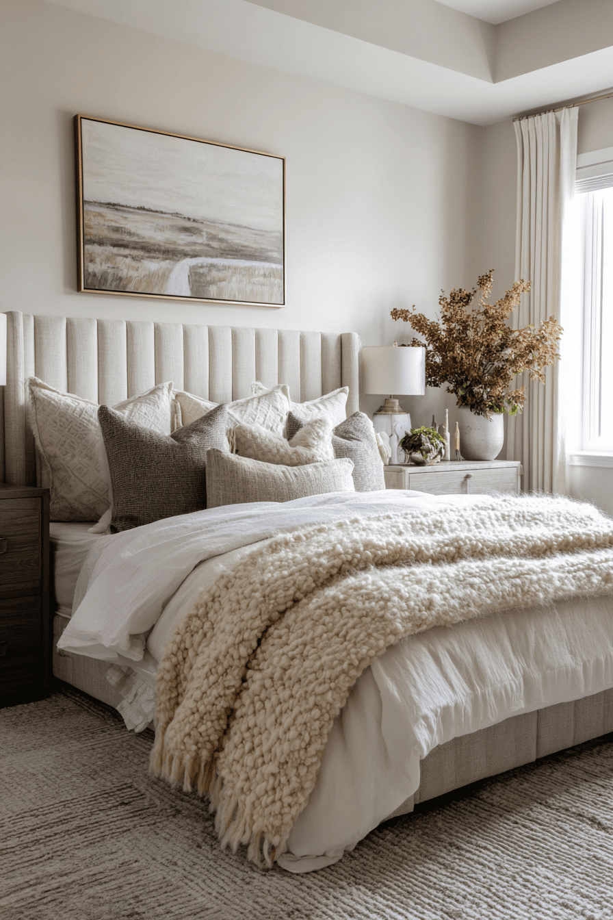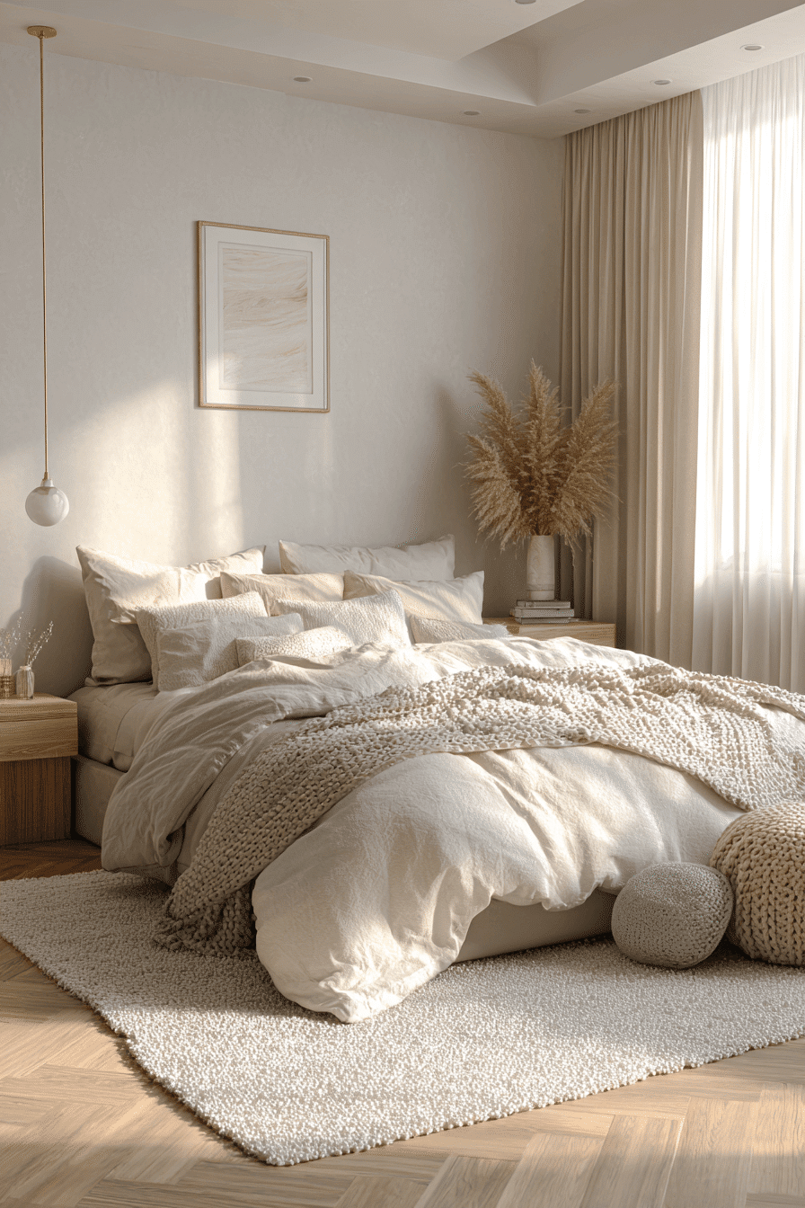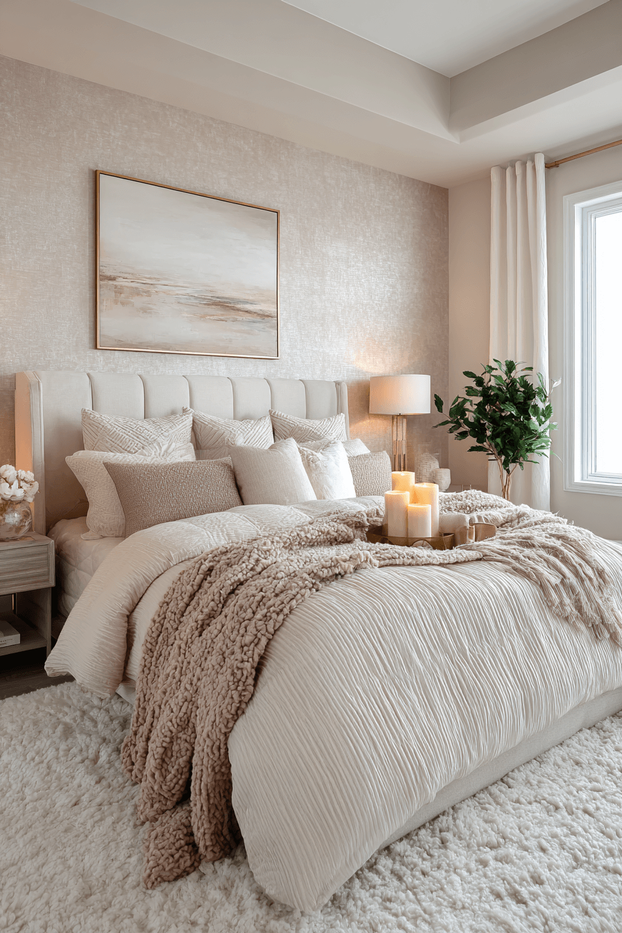 Cozy layered neutrals focus on mixing soft shades within the same color family for depth. Think ivory bedding, sand-toned pillows, and a warm beige throw all working together. This layering technique strengthens calming bedroom ideas by adding visual interest without introducing chaos. The textures do the talking instead of bold colors. The room feels inviting, intimate, and perfect for winding down. Explore how layering neutrals can elevate your space.
