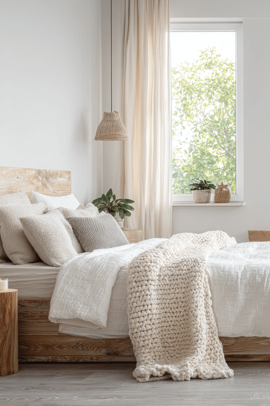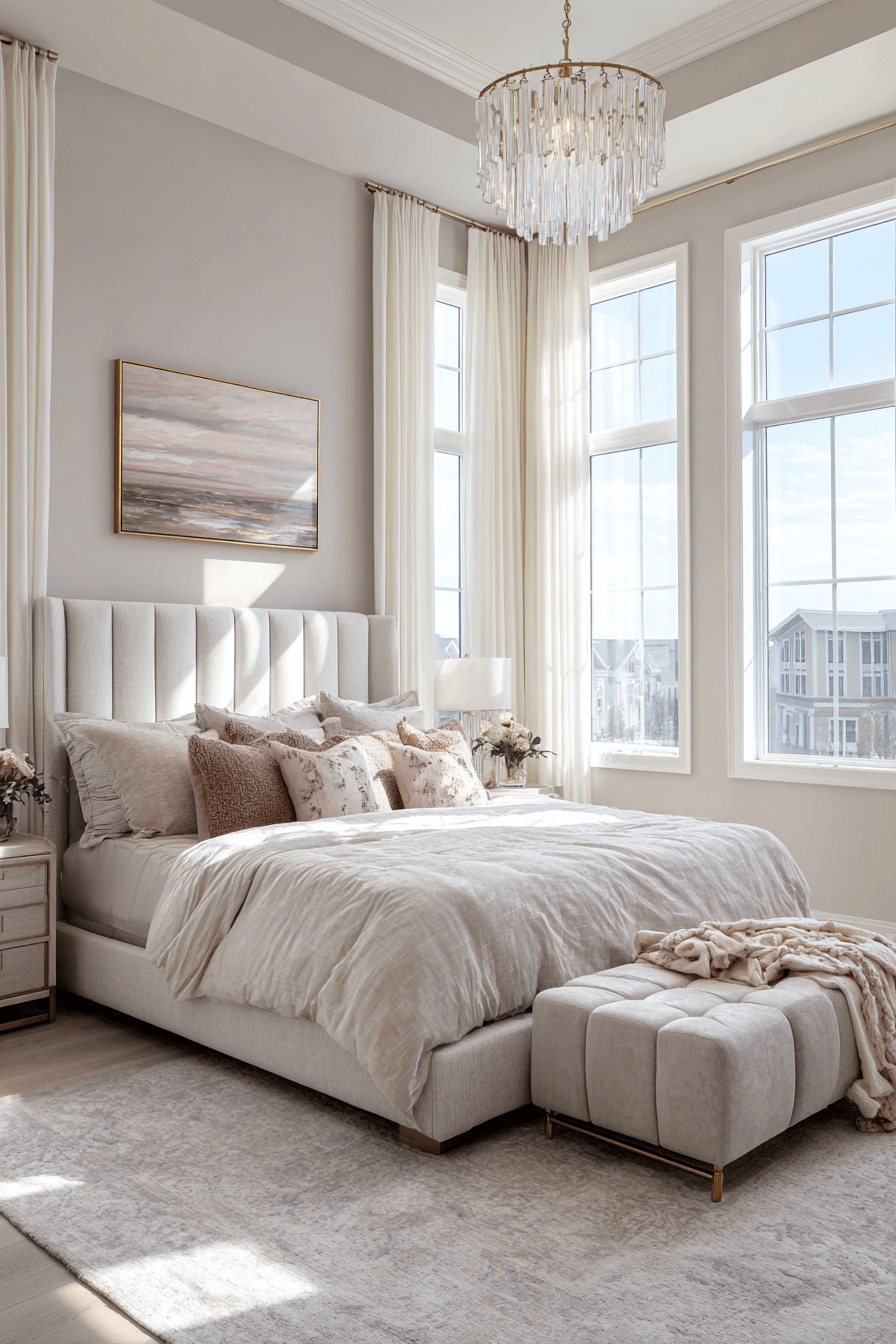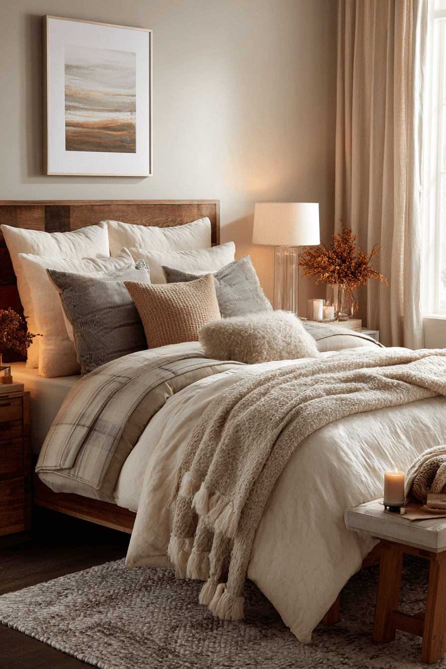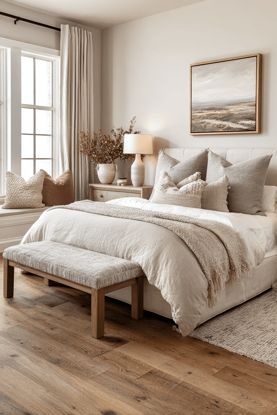 Cozy layered neutrals focus on mixing soft shades within the same color family for depth. Think ivory bedding, sand-toned pillows, and a warm beige throw all working together. This layering technique strengthens calming bedroom ideas by adding visual interest without introducing chaos. The textures do the talking instead of bold colors. The room feels inviting, intimate, and perfect for winding down. Explore how layering neutrals can elevate your space.