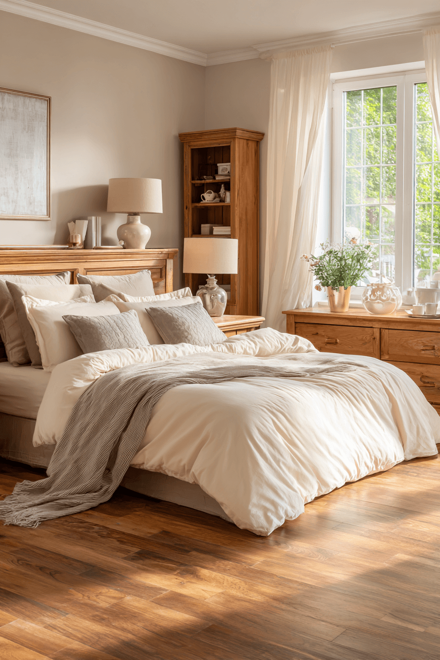 Cream and wood comfort pairs soft creamy tones with warm wood finishes. This classic combination feels timeless and nurturing. It fits perfectly into calming bedroom ideas because the warmth of wood balances the lightness of cream. Add subtle brass or woven accents for a touch of depth. The room feels grounded, welcoming, and beautifully cohesive. Click to recreate this effortlessly calming pairing.