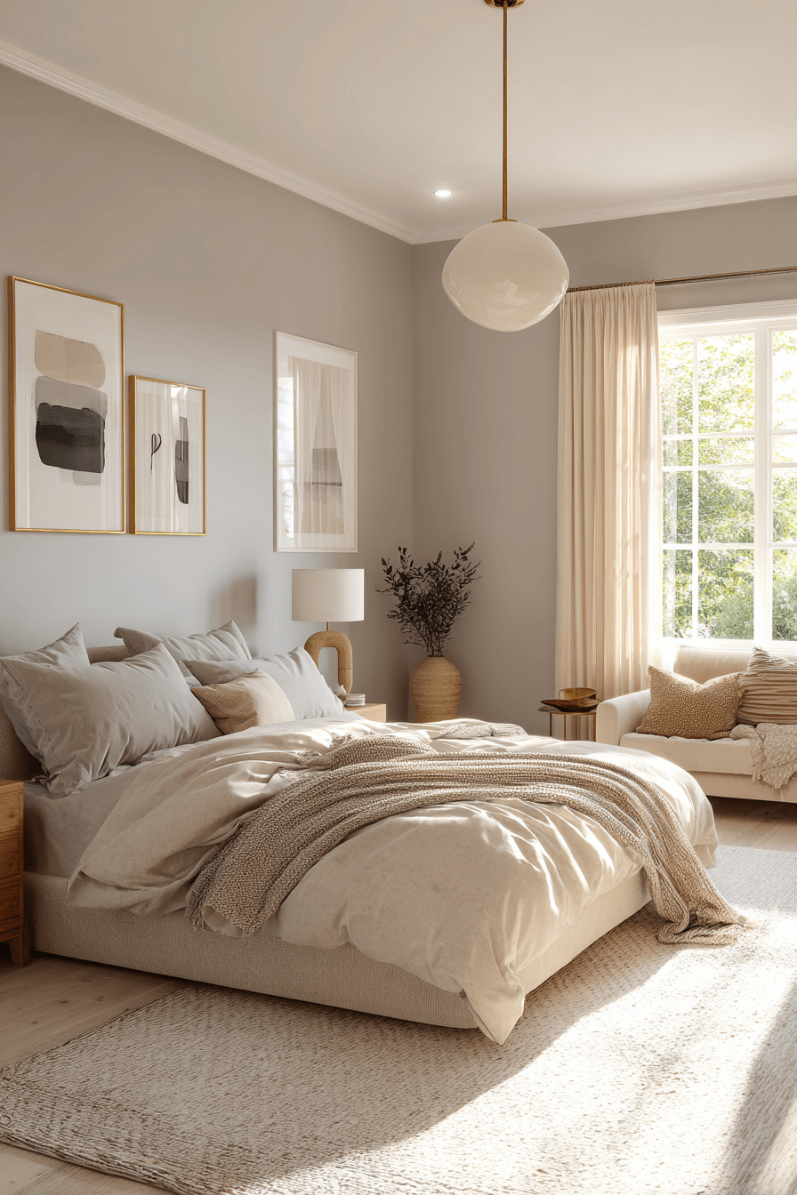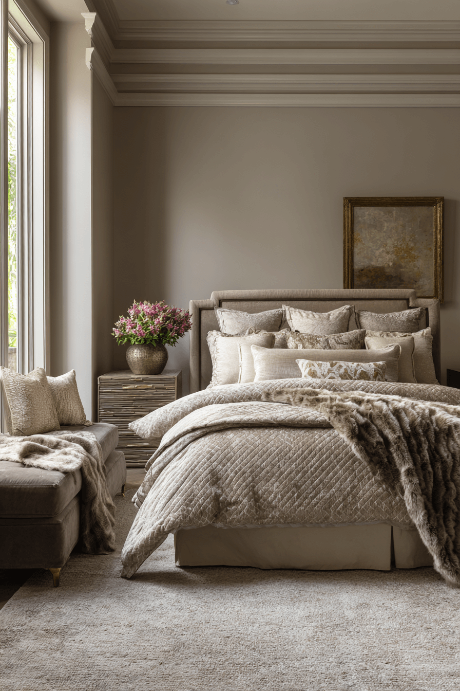 Warm greige cocoon blends gray and beige for a perfectly balanced neutral. This tone adapts beautifully to different lighting throughout the day. It fits seamlessly into calming bedroom ideas because it avoids extremes. Layer with cozy textiles and subtle metallic accents. The room feels modern yet nurturing. Tap to wrap your bedroom in greige warmth.