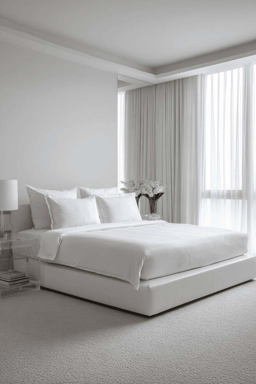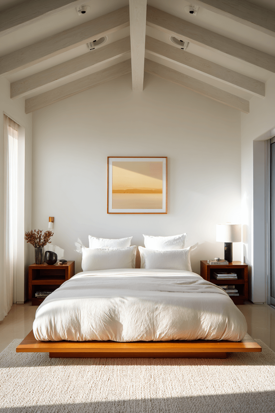Serene minimal retreat keeps only what truly matters and removes the rest. Clean lines, low-profile furniture, and clutter-free nightstands give your mind room to breathe. This style aligns perfectly with calming bedroom ideas since less visual distraction means deeper relaxation. Soft lighting and high-quality bedding keep the minimal look from feeling cold. The space feels purposeful, balanced, and quietly luxurious. Discover how simplifying your bedroom can completely change the way you rest.