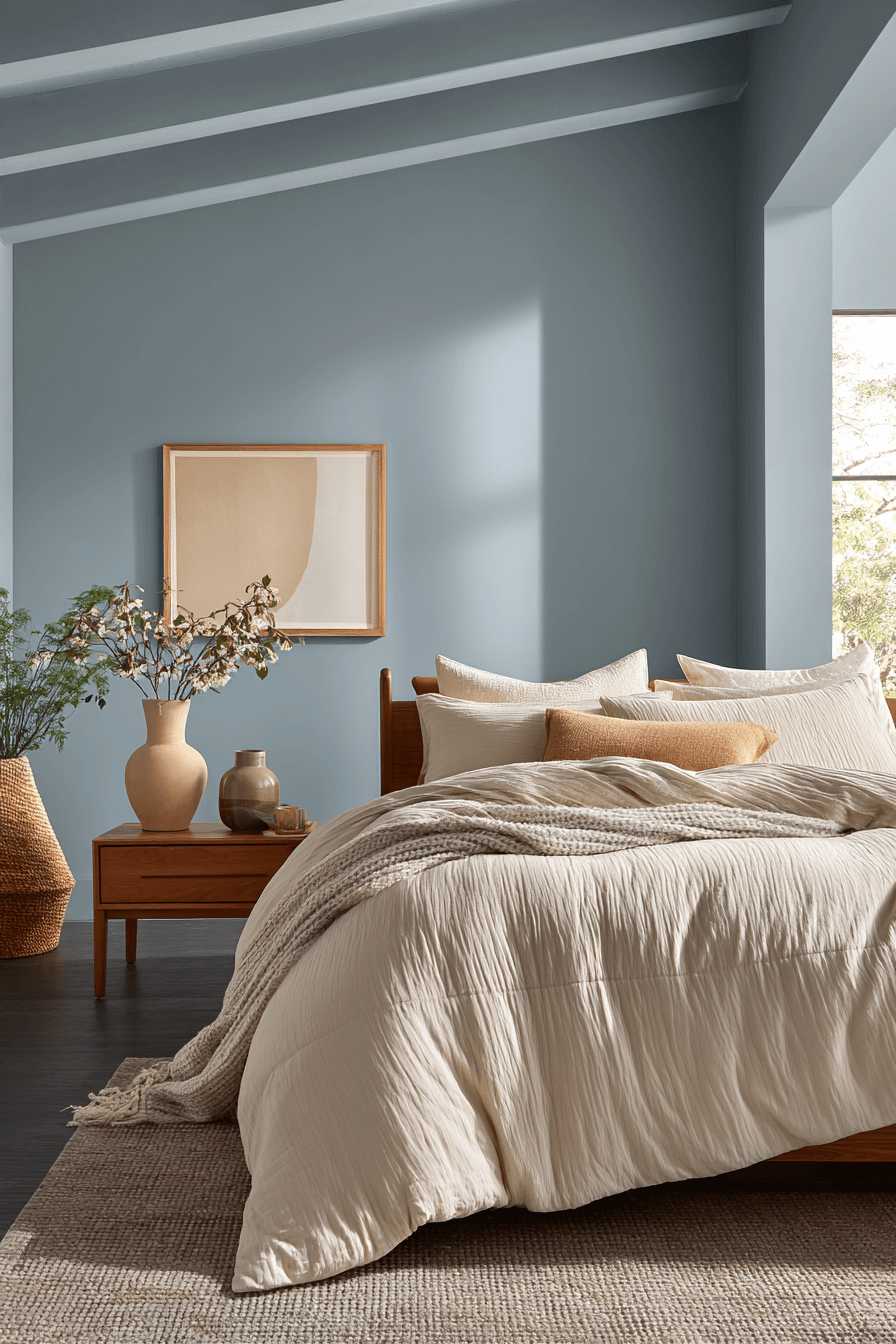 Dusty blue calm introduces a soft, muted blue that mimics sky at dusk. This shade naturally slows the mind and soothes the senses. It’s one of the most versatile calming bedroom ideas for those who want color without intensity. Pair it with cream bedding and warm woods. The atmosphere feels airy, tranquil, and comforting. Click to bring gentle blue into your bedroom.