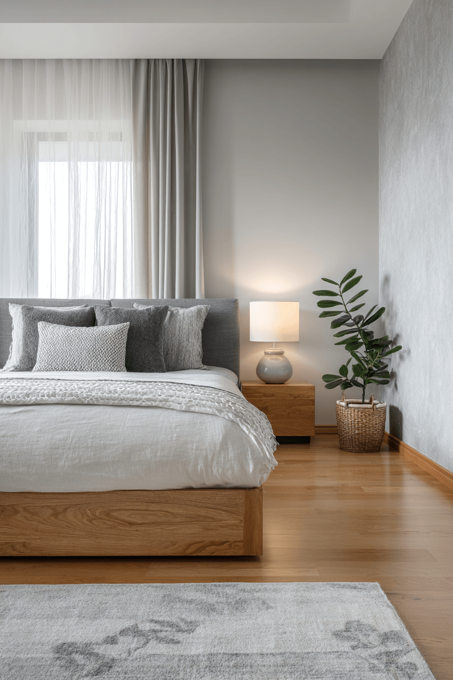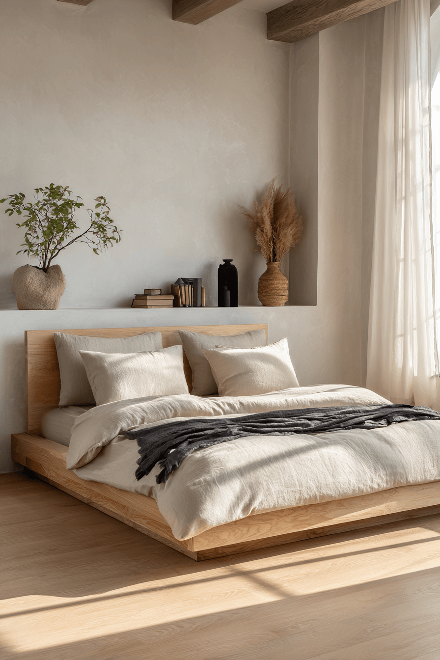 Natural wood serenity highlights oak, walnut, or ash finishes throughout the room. Wood grains add subtle visual movement without chaos. This supports calming bedroom ideas by connecting your interior to nature. Pair with soft linens and muted walls for balance. The result feels earthy and authentically peaceful. Tap to embrace wood-forward calm.