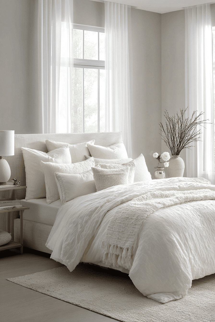 Cloud white calm embraces soft white tones that feel light and airy rather than stark. When layered with creamy textures and gentle shadows, white becomes inviting instead of clinical. This look fits beautifully into calming bedroom ideas because brightness can still feel soothing when done thoughtfully. Add sheer curtains and plush bedding to enhance the softness. The room feels fresh, open, and effortlessly peaceful. Tap to see how white can feel warm and dreamy.