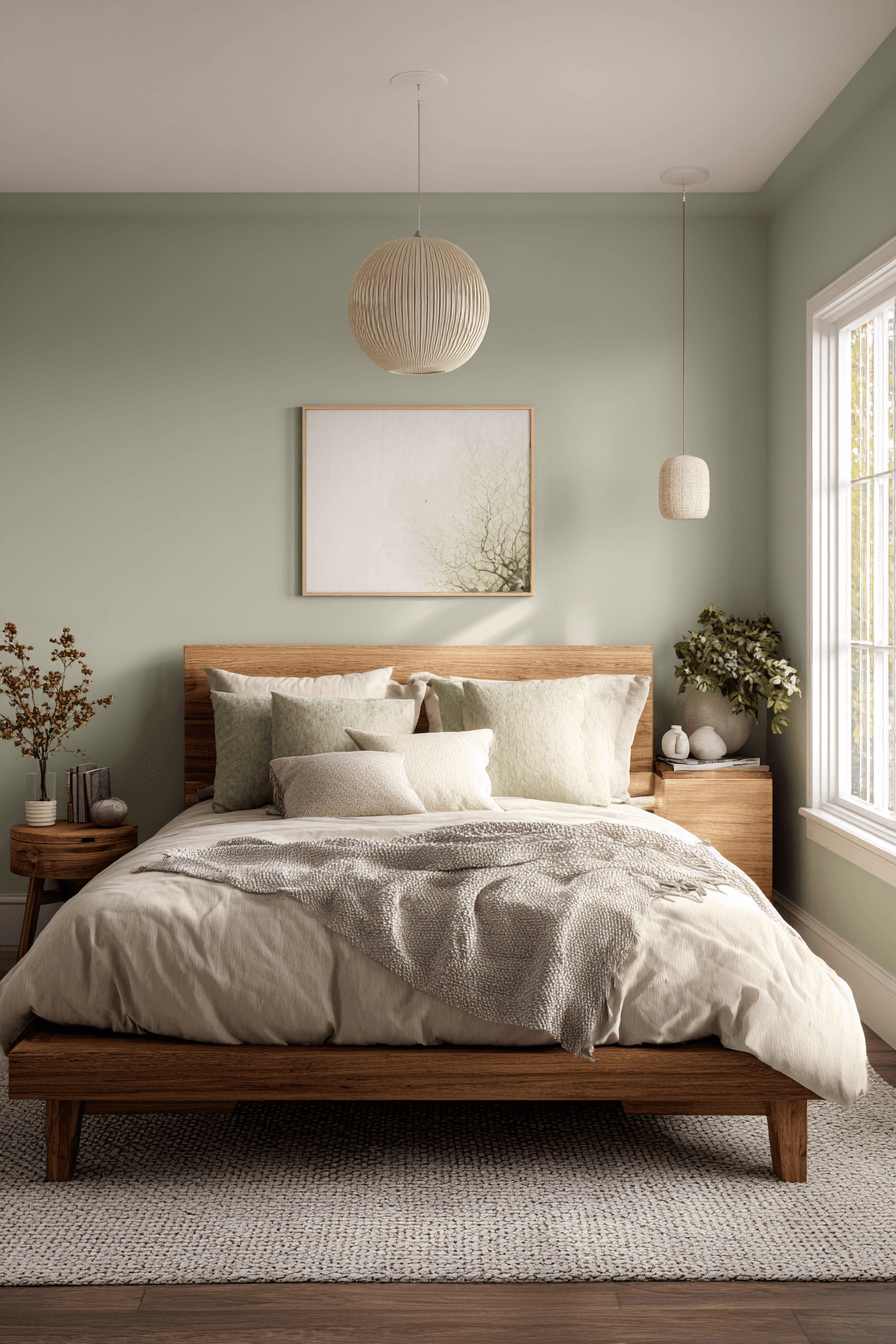 Muted sage serenity introduces a soft green that feels restful and organic. Sage walls or accents subtly connect your space to nature without overwhelming it. This makes it a standout choice for calming bedroom ideas, especially if you want gentle color. Paired with warm wood and creamy textiles, sage feels cozy and refined. The room feels fresh, balanced, and quietly rejuvenating. Tap to refresh your bedroom with soothing green tones.