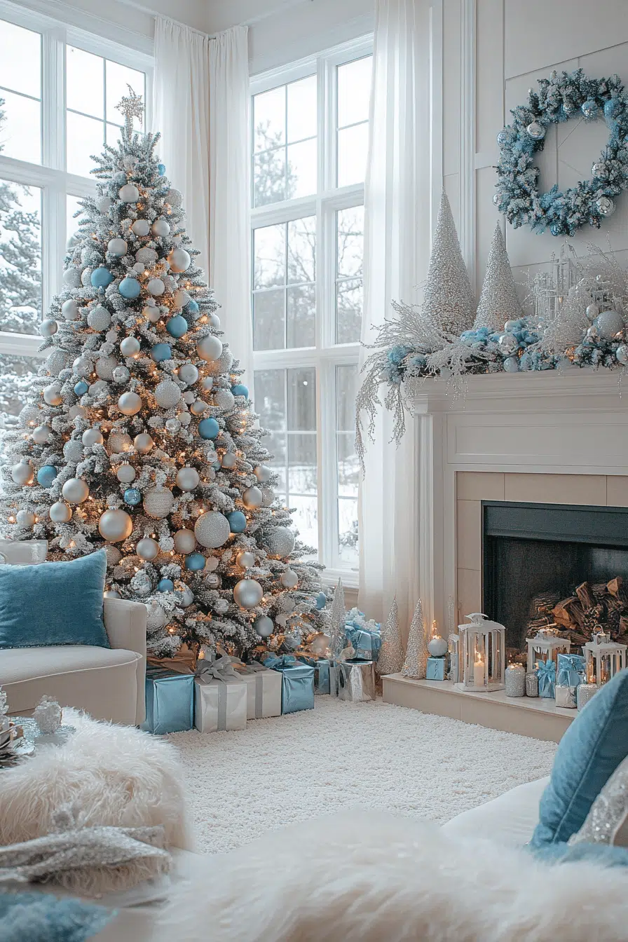 A whimsical winter wonderland living room showcases a dreamy Christmas aesthetic that brings the sparkle of a snowy day indoors. Soft blues, silvery accents, and plush white textures recreate the peaceful magic of winter. A tree glowing with frosted ornaments and delicate twinkle lights becomes the star of the room, surrounded by lanterns and snowy window accents. Cozy pillows and warm throws make this frosty setup irresistibly inviting.