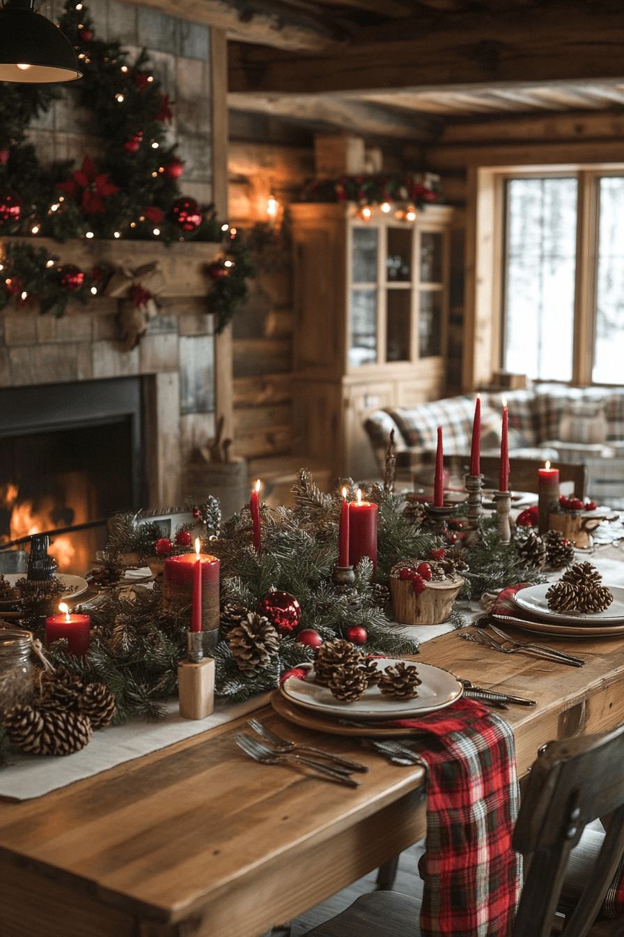 A rustic cabin kitchen filled with warm woods and plaid details brings a hearty Christmas aesthetic to life. Pine garlands, berry wreaths, and handcrafted wooden accents deliver that classic mountain‑lodge charm. Copper pots, cast‑iron touches, and natural textures add both warmth and character. This comforting style is ideal for anyone who loves a more grounded and homey holiday atmosphere.