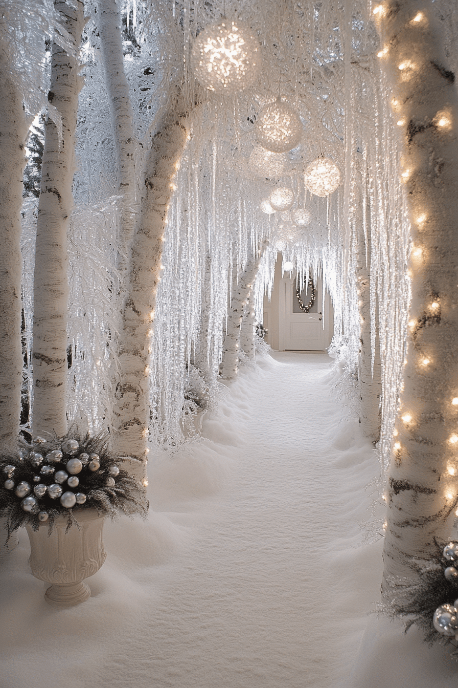 Turn your entryway into a magical frosted forest that beautifully showcases a mystical Christmas aesthetic. Painted white branches arranged in tall urns evoke a snowy woodland scene, enhanced with dangling crystal icicles. Soft white lights and shimmering silver décor elevate the ethereal mood, while a fluffy faux fur rug adds cozy warmth. This enchanting entrance sets a captivating tone for the rest of your home.