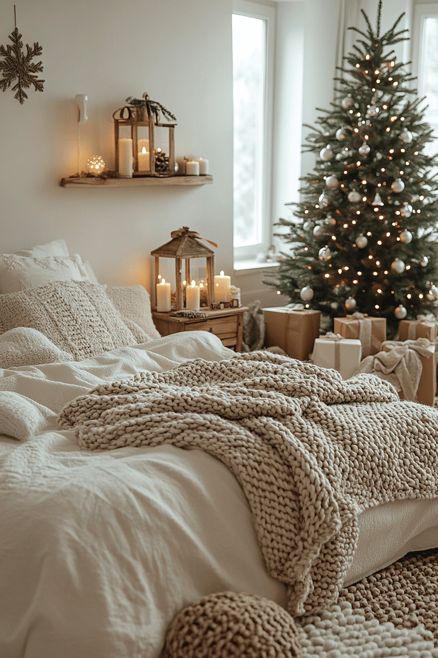 Create a peaceful Nordic bedroom using minimalist touches that embrace a serene Christmas aesthetic. Soft lighting, muted neutrals, and hints of red bring the cozy warmth of Scandinavian design. Natural wood pieces, simple ornaments, and textured textiles add charm without clutter. A tiny evergreen decorated with handmade accents completes the restful atmosphere.