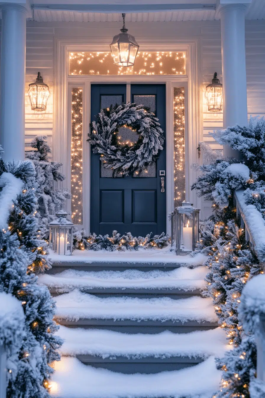 Transform your entryway into a magical winter escape with Christmas porch decor that captures the essence of a snowy wonderland. Use icy blue, white, and silver accents paired with frosted wreaths and shimmering lights for a serene, snow-kissed vibe. Faux snow on garlands and subtle twinkle lights make it feel like a dreamy winter evening. This style brings elegance and enchantment to your doorstep.