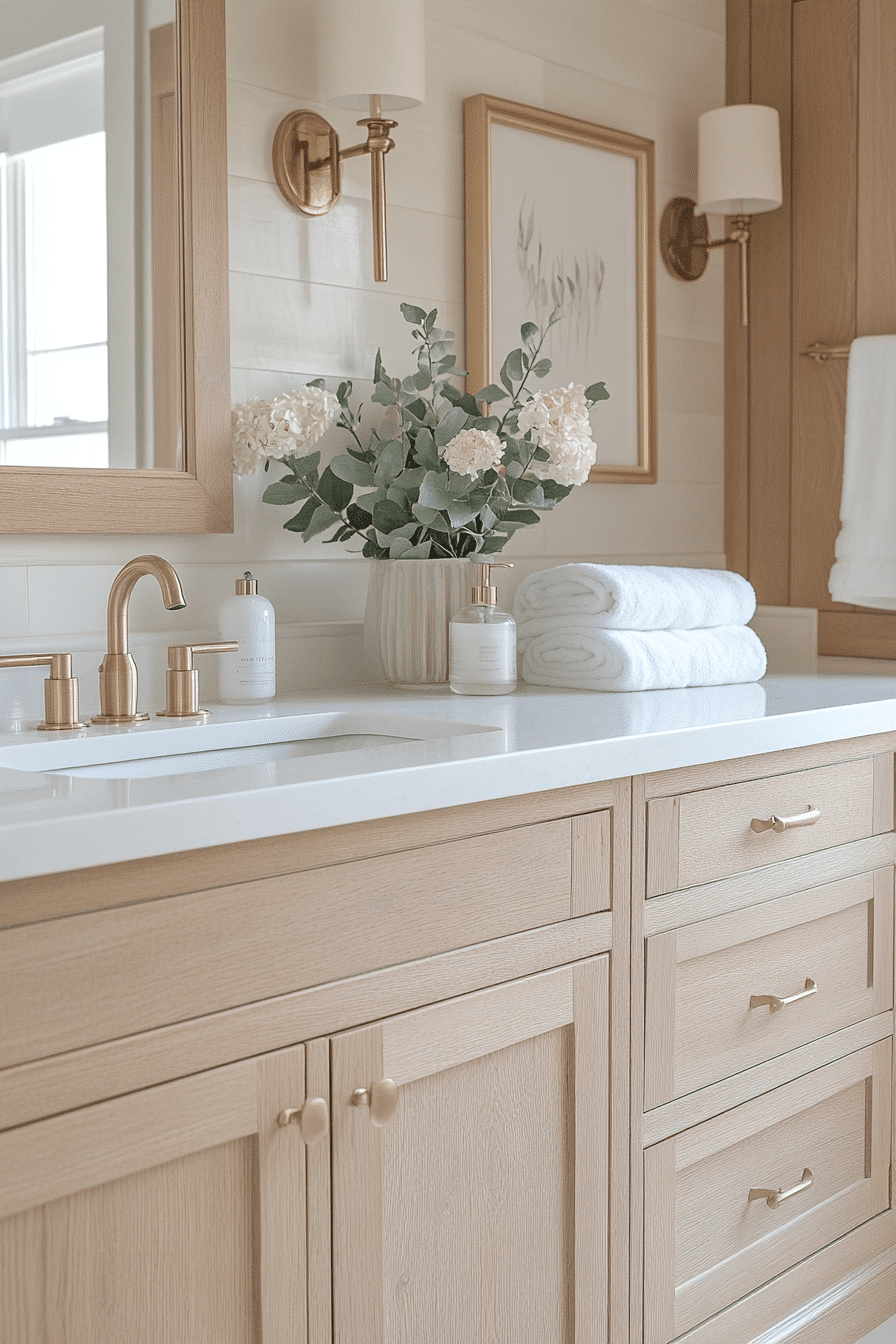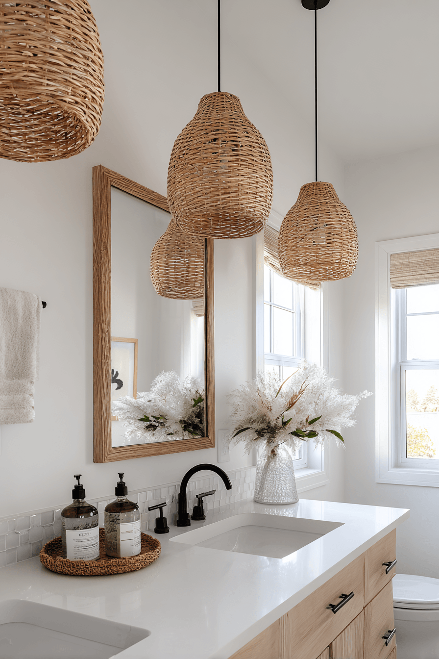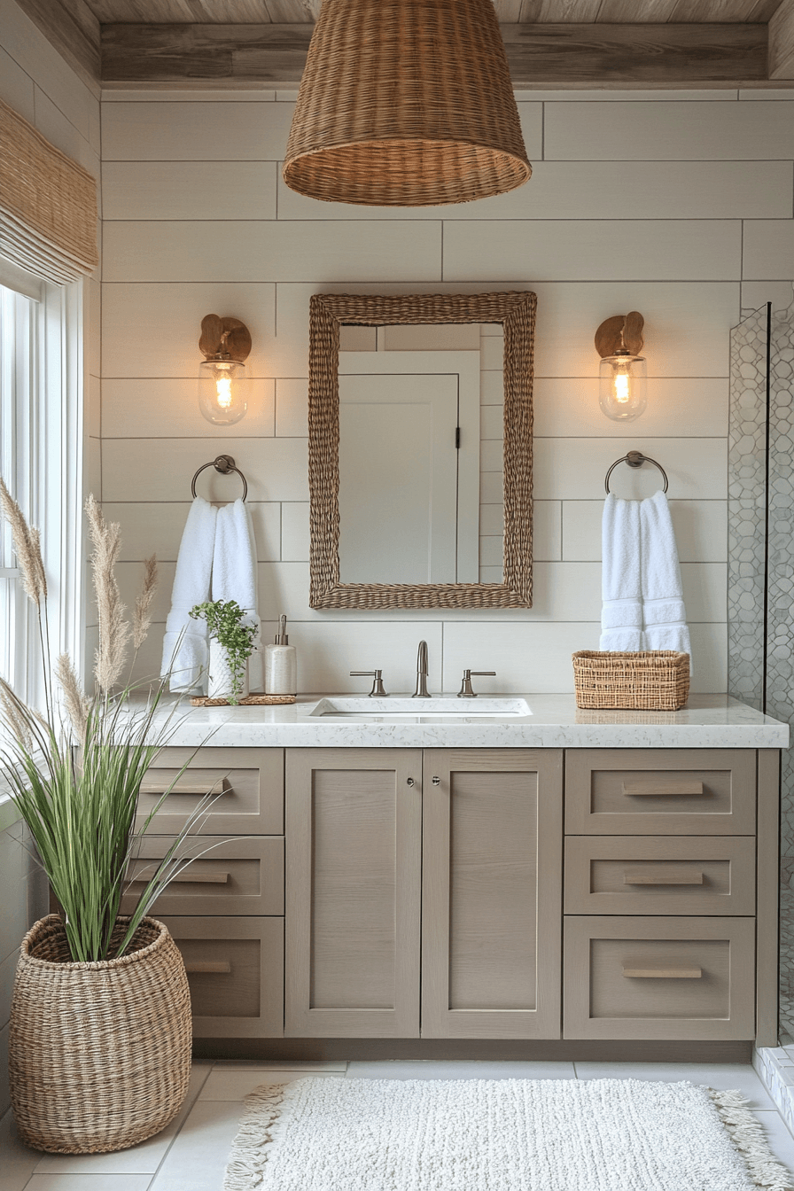 Rattan lighting introduces warmth and texture into coastal bathroom ideas while keeping the look relaxed and stylish. The woven design pairs perfectly with white surfaces, natural wood, and sandy tones. Whether you choose a bold pendant or subtle sconces, it adds a cohesive coastal feel. The texture softens modern lines and creates a welcoming ambiance. It’s a simple upgrade that feels both trendy and timeless. Brighten your home with coastal bathroom ideas featuring rattan lighting!