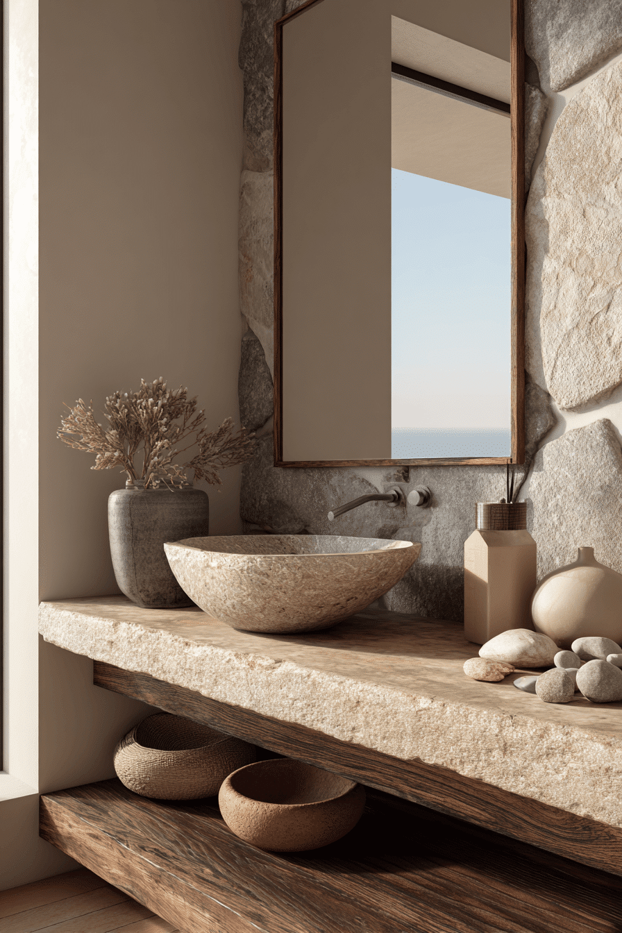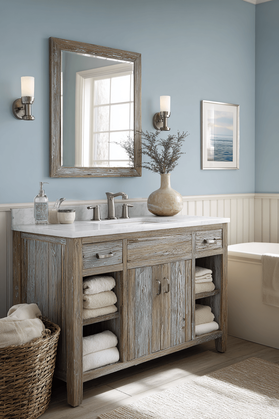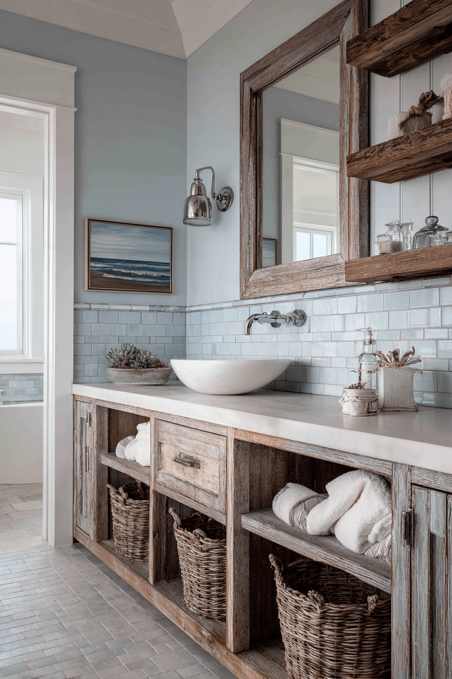 A driftwood-inspired vanity introduces natural texture and coastal character into your coastal bathroom ideas. The weathered finish brings in that authentic seaside feel while still looking polished and stylish. When paired with crisp sinks and subtle metallic fixtures, it creates a beautiful balance of rustic and refined. Add simple coastal decor like framed shells or soft-toned artwork to complete the look. This design feels relaxed, warm, and effortlessly inviting. See how coastal bathroom ideas come to life with driftwood-inspired vanities!