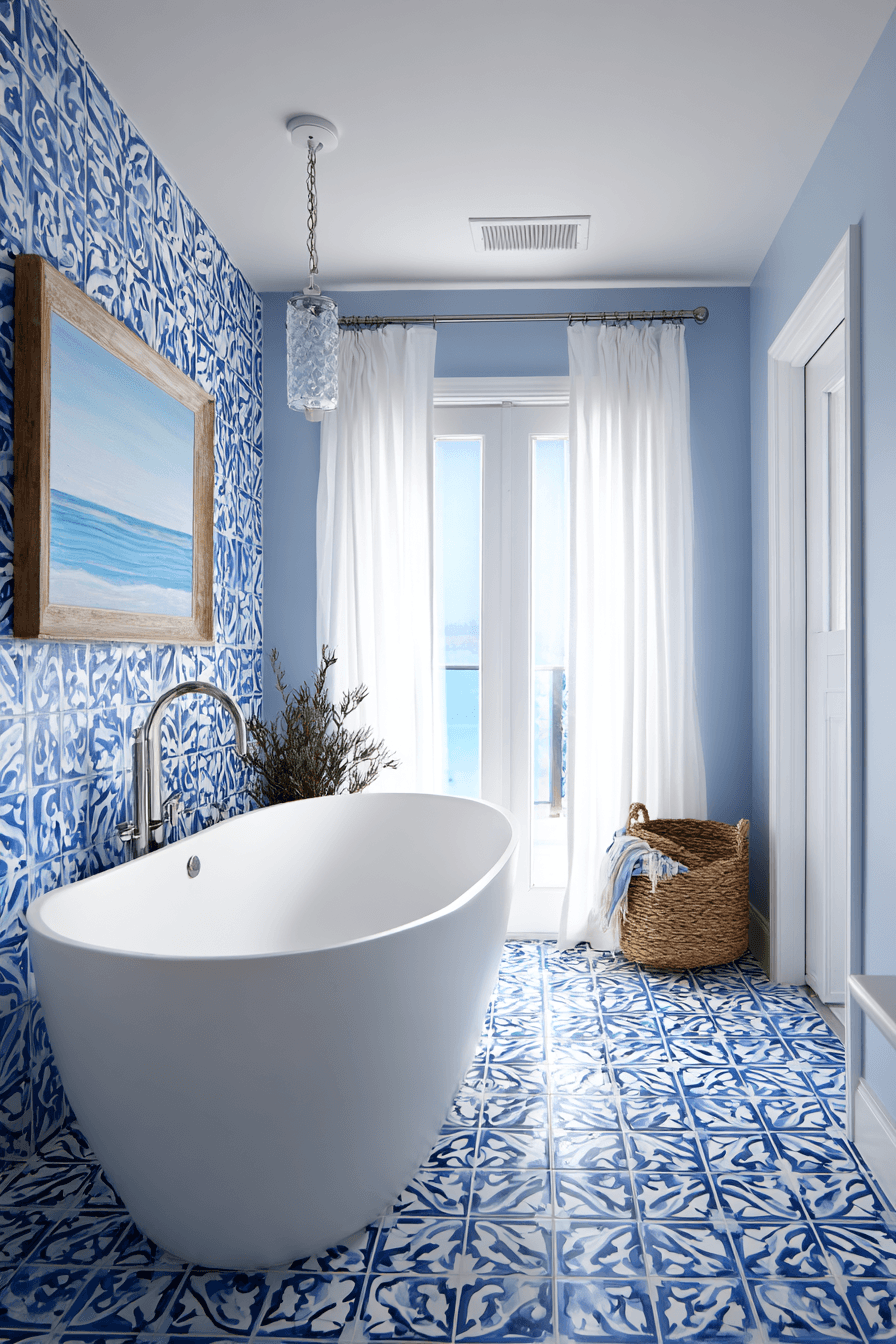 Patterned tiles bring personality and movement into coastal bathroom ideas while keeping the look light and breezy. Soft blues, whites, and seafoam tones create a refreshing coastal palette that feels lively yet balanced. Whether used on the floor or as a statement wall, the patterns draw the eye without overwhelming the space. Pairing them with simple finishes allows the design to truly stand out. It’s an easy way to add charm and visual interest. Find coastal bathroom ideas that make patterned tile the star of the space!