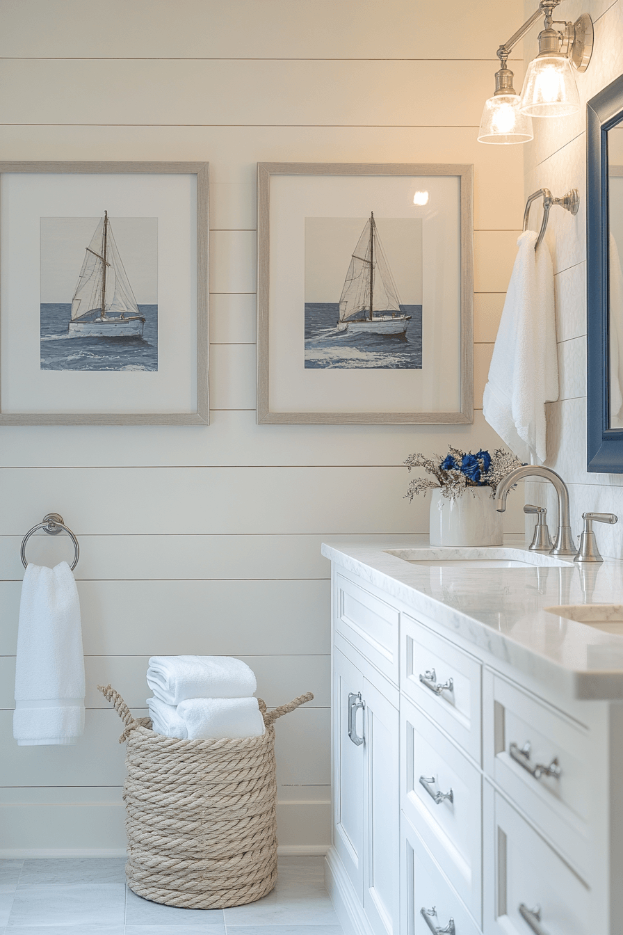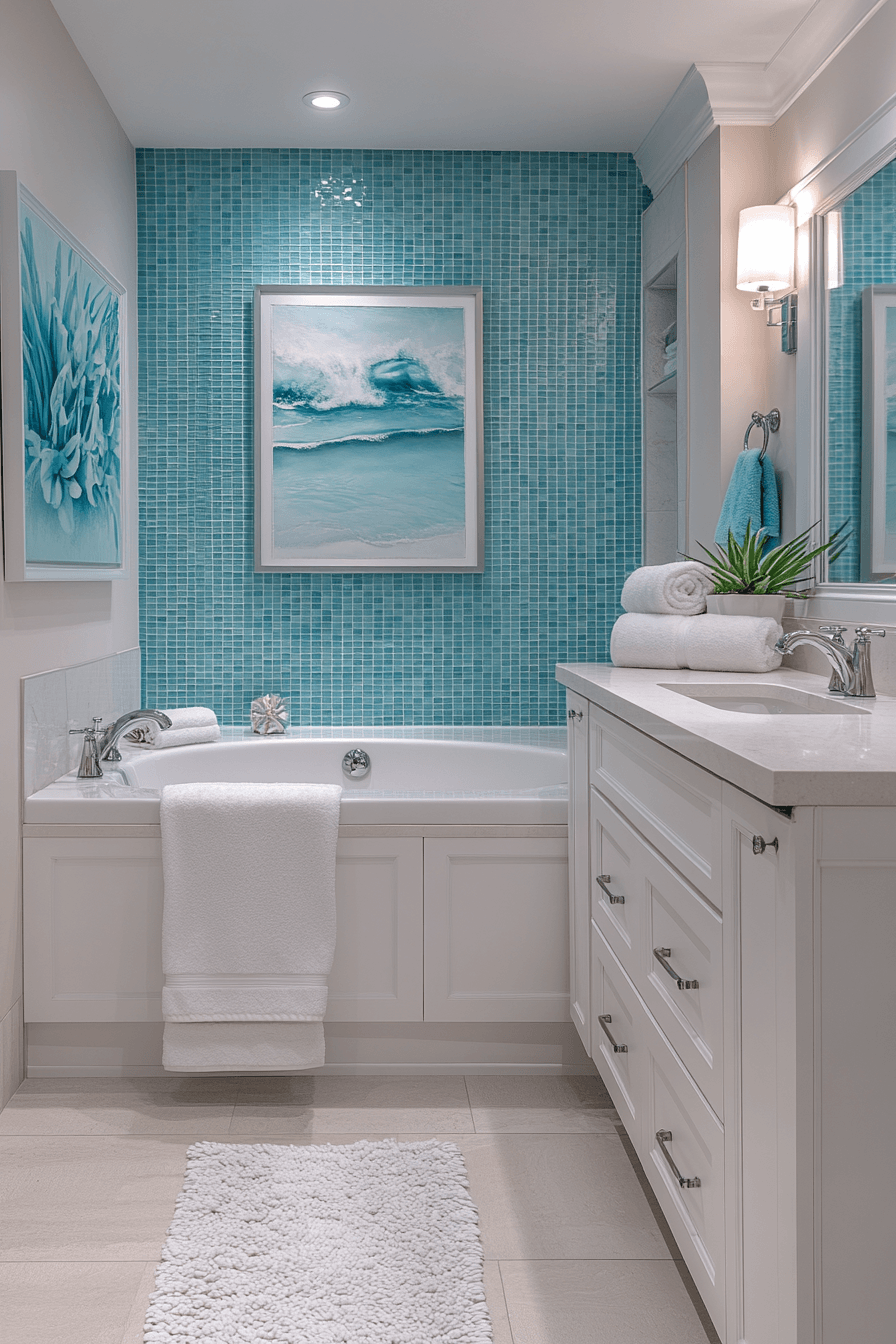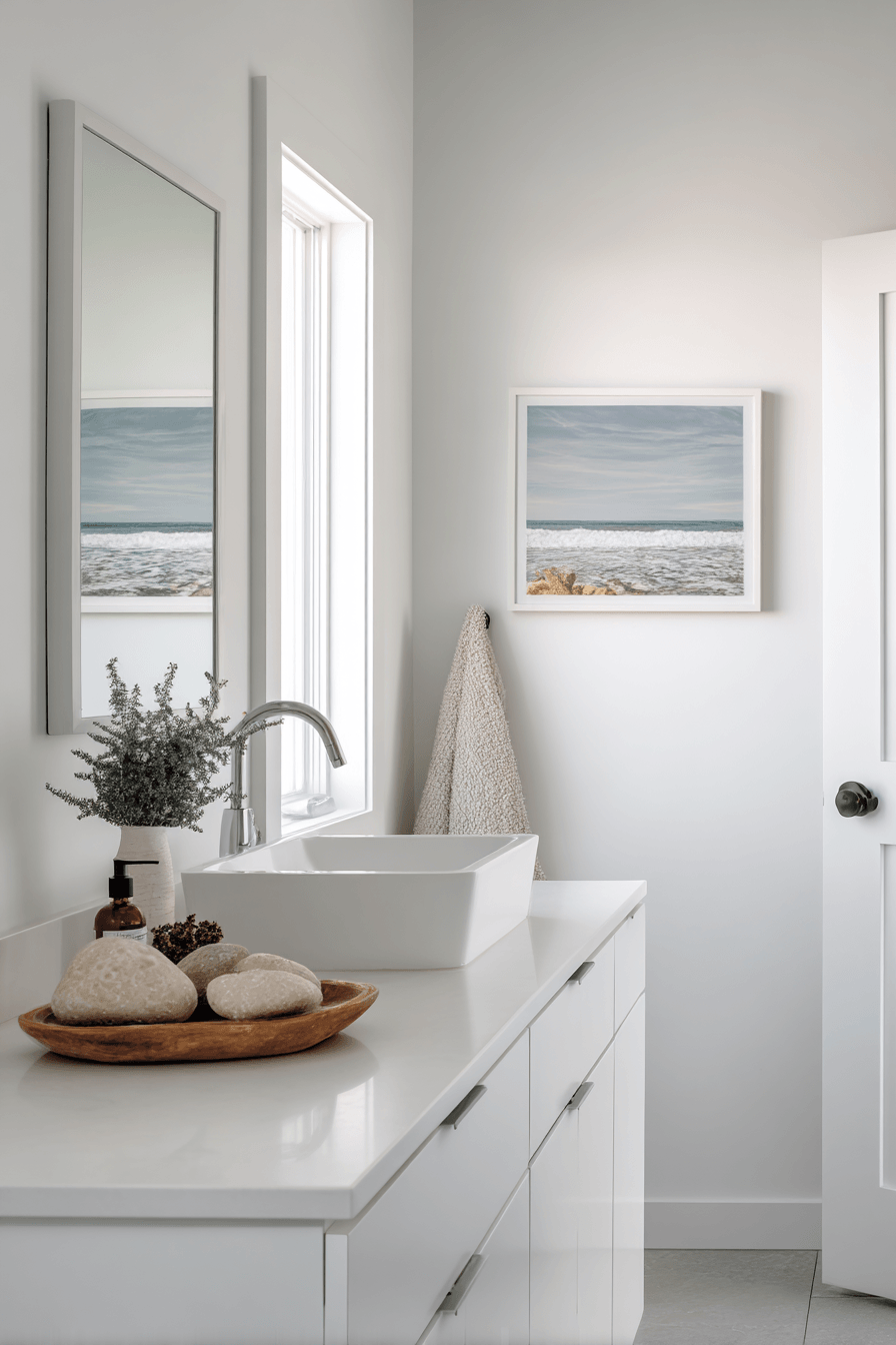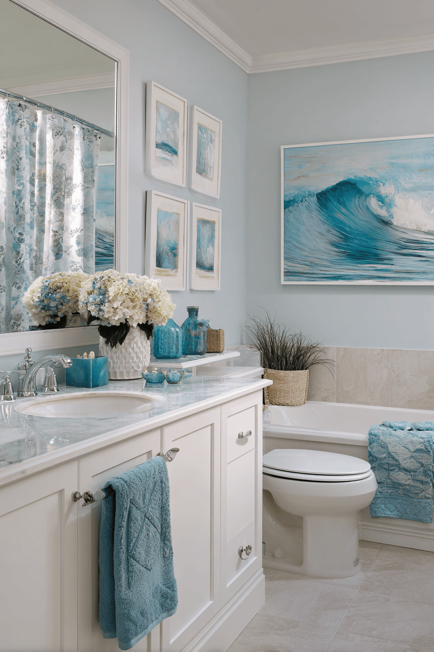 Ocean-inspired decor adds personality and charm to coastal bathroom ideas, turning the space into a true seaside escape. Think wave-inspired artwork, coral accents, or framed ocean photography to bring the theme to life. Keeping the base palette neutral allows these details to stand out effortlessly. Soft blues, seafoam greens, and deep navy tones reinforce the coastal mood. These thoughtful touches make the space feel curated and inviting. Explore coastal bathroom ideas that bring ocean vibes indoors!