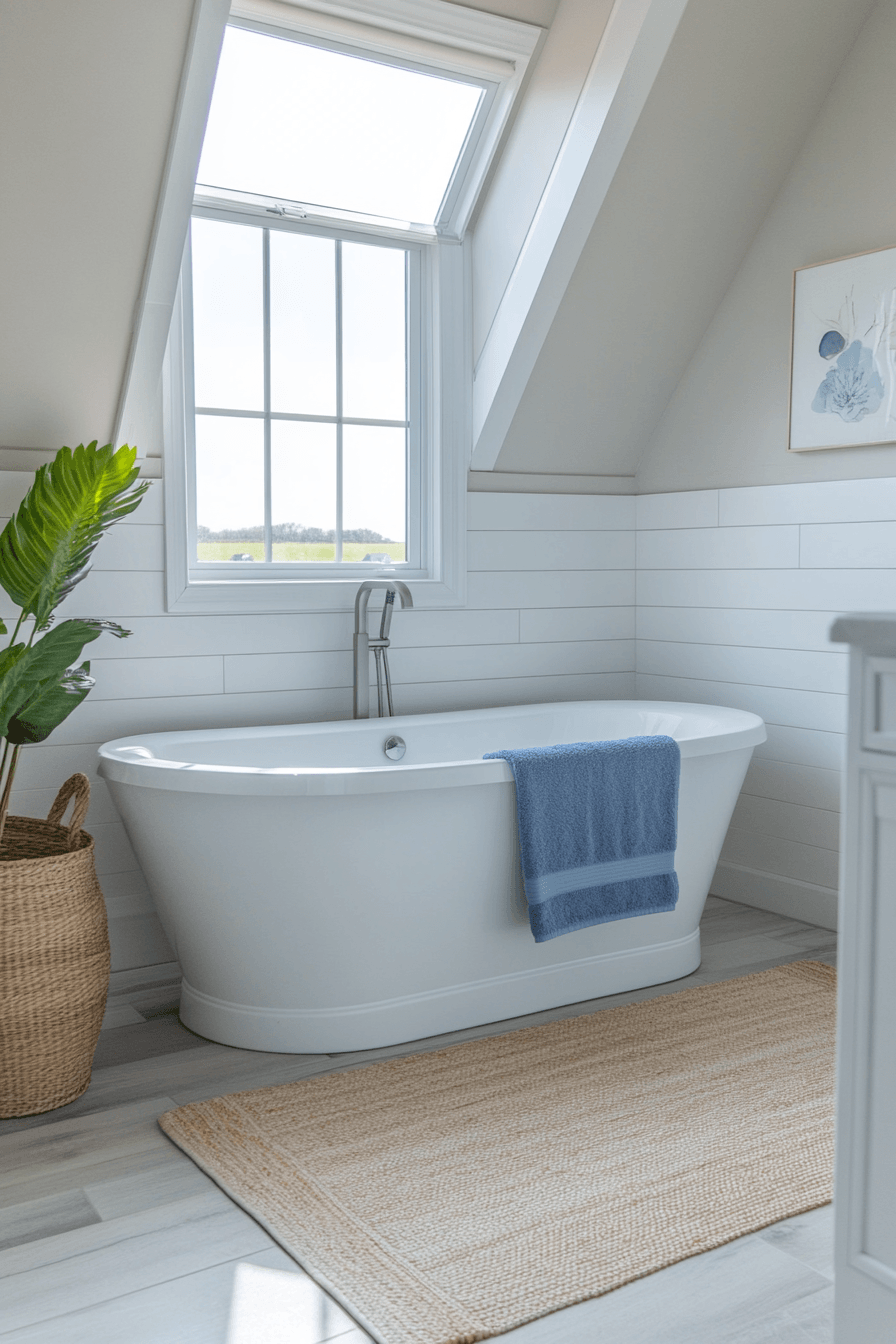 A skylight floods coastal bathroom ideas with natural sunlight, instantly creating a bright and uplifting atmosphere. Paired with crisp white walls and soft wood accents, the space feels open, airy, and spa-like. Light blue tiles and gentle finishes enhance that breezy, beach-inspired glow. Sunlight also brings out the beauty of textures like stone, linen, and seagrass. The overall effect is calm, radiant, and refreshingly peaceful. Discover coastal bathroom ideas that shine with beautiful natural light!