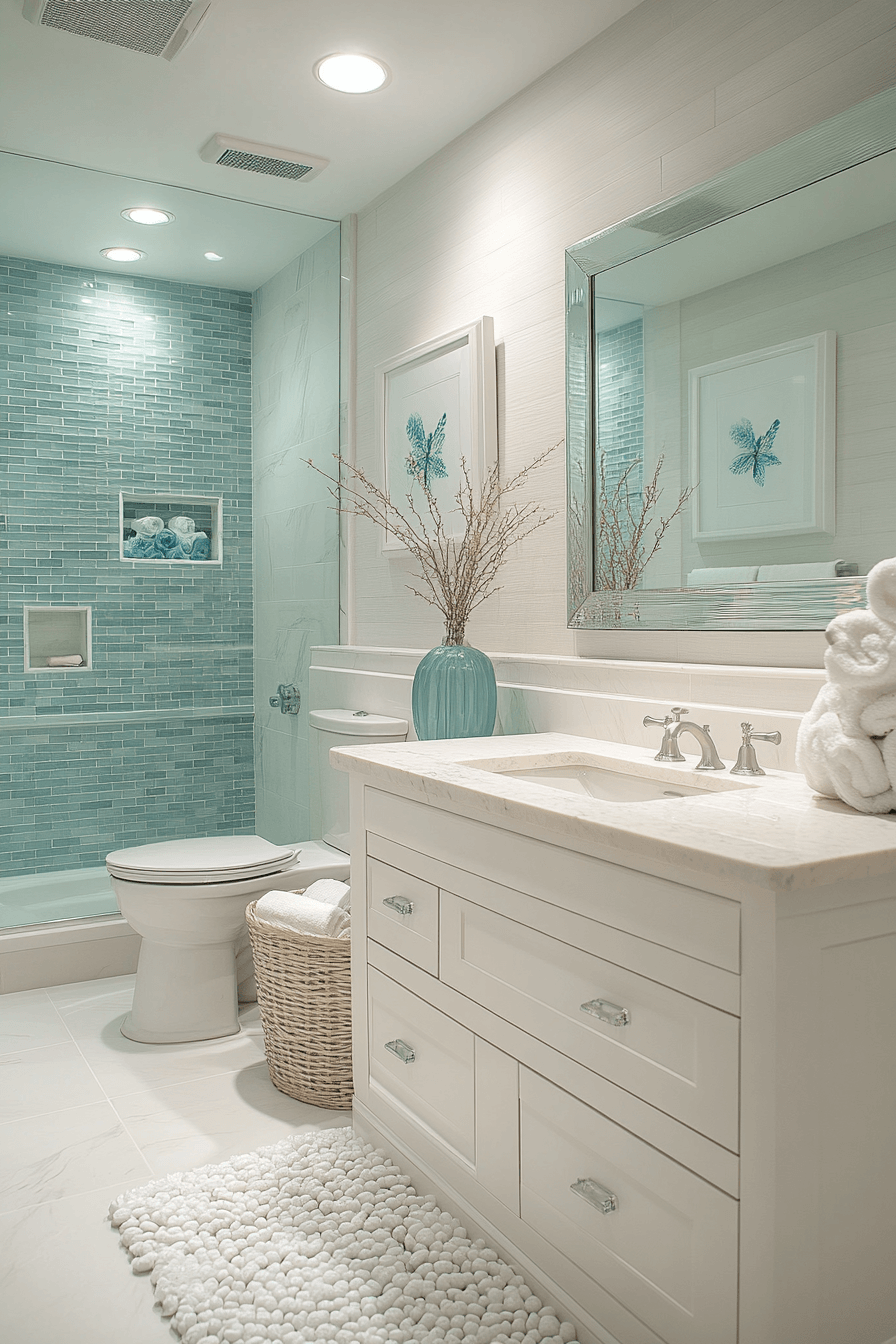 A crisp mix of white and aqua creates a bright, refreshing look in coastal bathroom ideas. Aqua accents bring a splash of ocean-inspired color while white keeps the space feeling clean and open. Metallic finishes add a subtle shine that enhances the overall brightness. This combination works especially well in smaller bathrooms, making them feel larger and more vibrant. It’s a classic coastal palette that never goes out of style. Refresh your space with coastal bathroom ideas inspired by white and aqua tones!