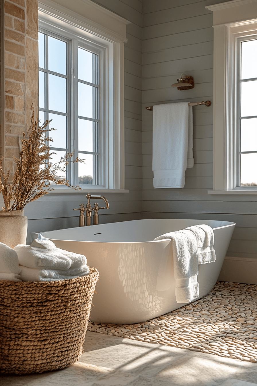 Turn your space into a relaxing escape with spa-like coastal bathroom ideas that focus on comfort and calm. Soft neutrals, pebble textures, and airy linens create a soothing environment. Adding features like a freestanding tub or gentle lighting enhances the retreat-like feel. Subtle coastal scents and decor complete the experience. The result is both luxurious and deeply relaxing. Create your dream retreat with coastal bathroom ideas designed for total relaxation!