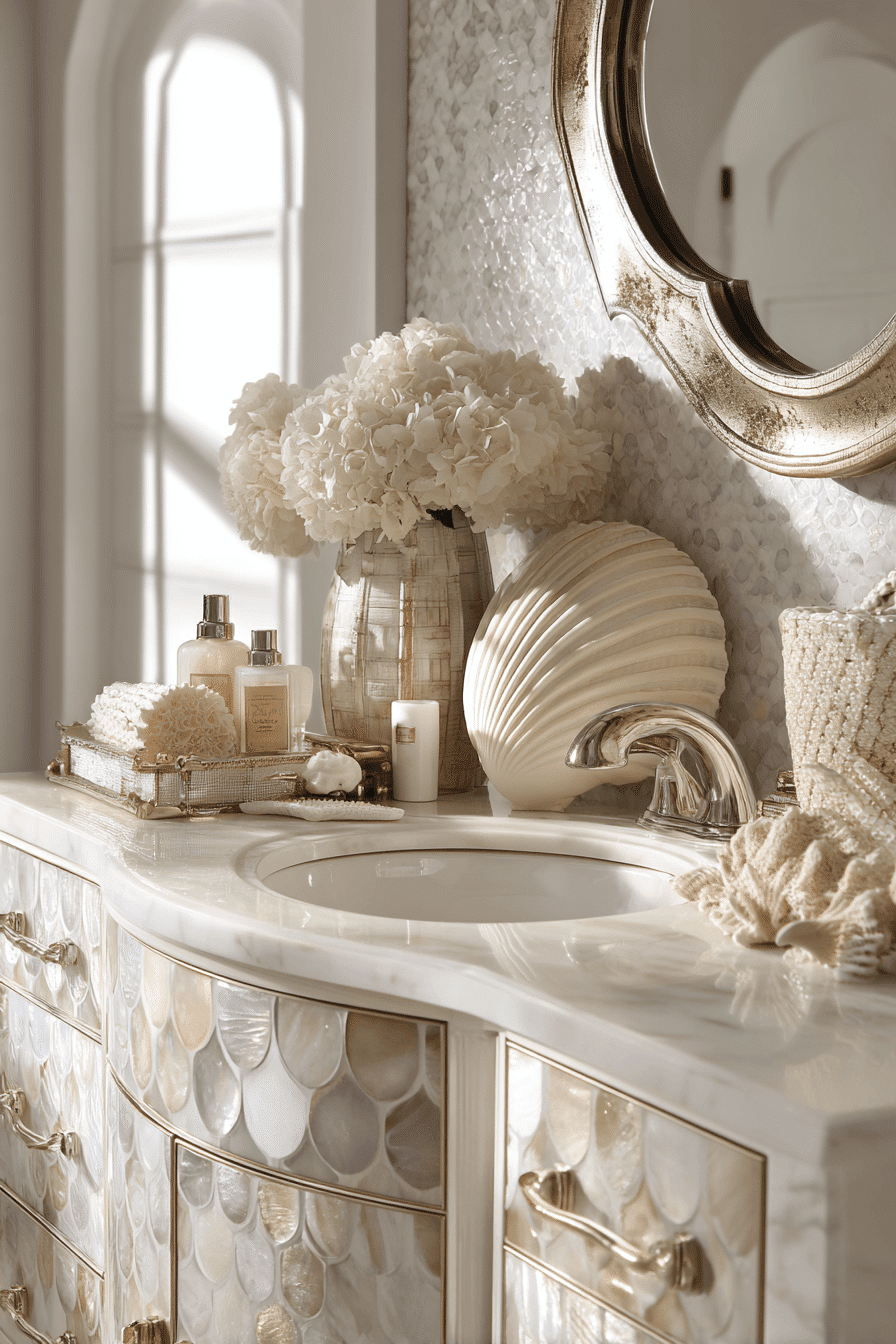 Shell-inspired details introduce a delicate, beachy elegance to coastal bathroom ideas. Curved shapes, shell-style mirrors, or subtle hardware create a soft and graceful aesthetic. Adding pearly finishes or sea-glass accents brings in a gentle shimmer that feels fresh and coastal. A mostly neutral palette with hints of blush or seafoam keeps everything light and balanced. The overall effect feels airy, refined, and effortlessly charming. Step into coastal bathroom ideas that highlight beautiful shell-inspired touches!