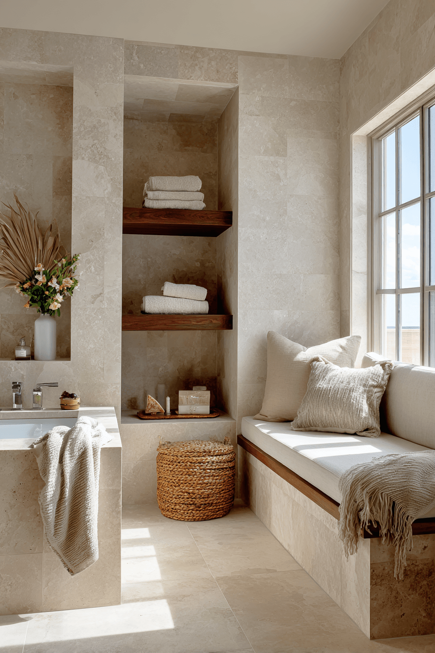 Built-in benches add both comfort and functionality to coastal bathroom ideas, instantly giving the space a spa-like upgrade. Whether tiled into the shower or placed along a wall, they create a cozy, intentional feature. Styling with soft cushions, rolled towels, or simple coastal decor enhances the relaxed feel. It’s a practical addition that also elevates the overall design. The space becomes more inviting and thoughtfully designed. Discover coastal bathroom ideas that blend comfort and style seamlessly!