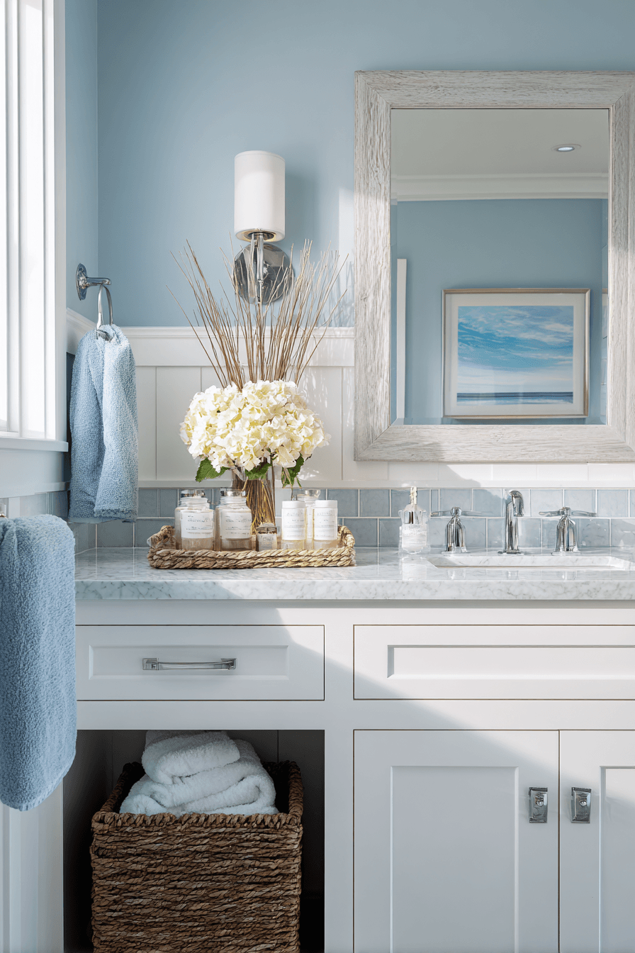 Soft pale blue tones create a calm and dreamy foundation for coastal bathroom ideas. Whether used on walls, cabinetry, or tile, the color reflects the serenity of sky and sea. Pairing it with crisp white or natural wood keeps the look fresh and balanced. Small accents like driftwood or shell decor complete the coastal feel. The result is peaceful, light, and effortlessly beautiful. Find coastal bathroom ideas that showcase this soothing blue palette!