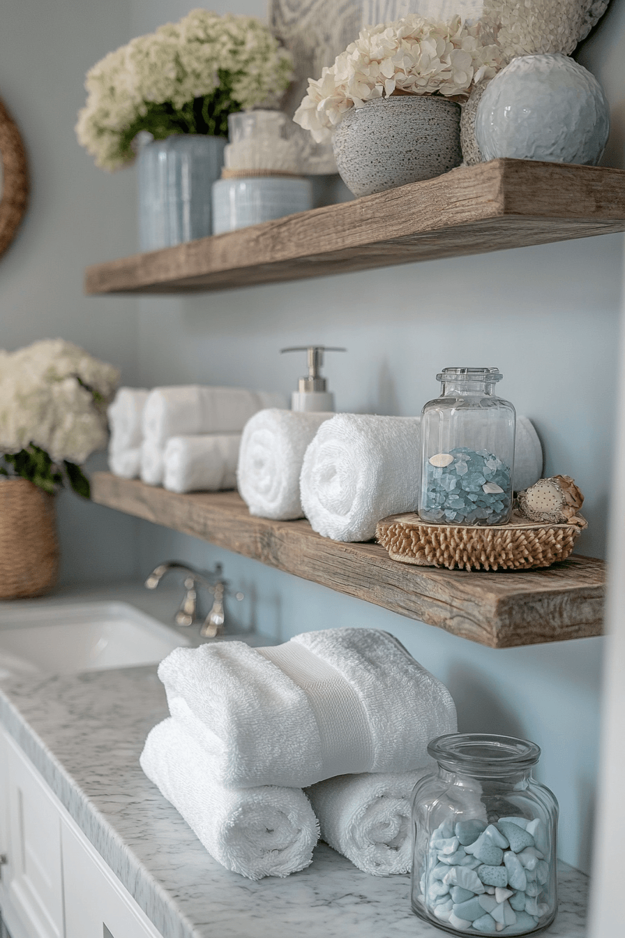 Open shelving adds both charm and practicality to coastal bathroom ideas, creating a light and airy display space. Styled with rolled towels, sea glass accents, or simple decor, it instantly gives a curated beach-house vibe. White or weathered wood finishes keep everything feeling fresh and relaxed. This design trick is especially helpful for making smaller bathrooms feel more open. It’s an easy way to showcase coastal details without cluttering the room. Discover coastal bathroom ideas that make open shelving look effortlessly stylish!