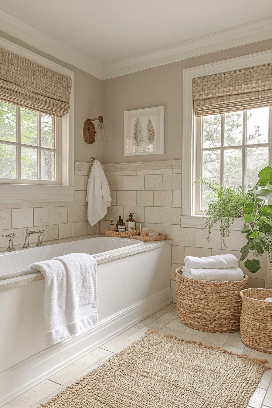 Soft neutral palettes set a soothing tone in coastal bathroom ideas, creating a peaceful, spa-like escape. Shades like sandy beige, creamy white, and gentle taupe mirror the calm of the shoreline. Adding woven textures and stone accents introduces subtle layers of interest. This timeless color scheme works beautifully for both modern and classic designs. It’s perfect if you want a serene coastal look without bold colors. Uncover more coastal bathroom ideas that embrace calming neutral vibes!