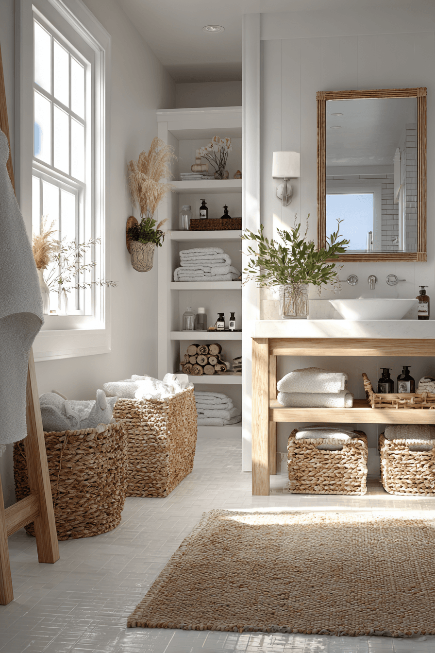 Seagrass accents bring a natural, earthy touch to coastal bathroom ideas while adding texture and warmth. From woven baskets to rugs and small decor pieces, these elements create a grounded, beach-inspired atmosphere. They pair effortlessly with whites and soft blues, enhancing the relaxed coastal palette. The organic texture keeps the space from feeling flat or overly polished. It’s a simple way to introduce coastal charm with a refined edge. Get inspired by coastal bathroom ideas featuring beautiful seagrass details!