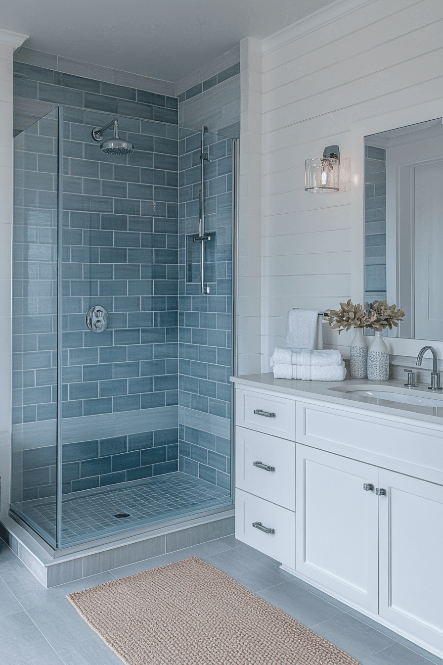 A sleek glass shower instantly opens up coastal bathroom ideas, making the space feel brighter and more expansive. The clear design lets details like pebble floors or ocean-toned tiles stand out effortlessly. Pairing it with light wood or white finishes enhances the breezy, coastal feel. This setup creates a clean, spa-like environment that feels both modern and relaxing. It’s a stylish upgrade that works in bathrooms of any size. Explore coastal bathroom ideas that showcase stunning glass shower designs!