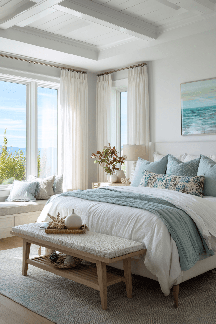 Soft ocean tones and airy textures instantly define a coastal guest bedroom that feels calm and welcoming. Light fabrics, woven accents, and gentle blues create a space that mirrors the peaceful rhythm of the sea. Sheer curtains sway softly with the breeze, while layered bedding in crisp whites and pale aqua adds a plush, inviting touch. Natural light enhances every detail, making the room feel open and refreshing without overwhelming the senses. Subtle decor like driftwood finishes, coral-inspired accessories, and ocean artwork adds character while keeping the look clean and modern. The overall mood is relaxed, polished, and effortlessly inviting for any guest. Click to explore more coastal-inspired bedroom ideas!