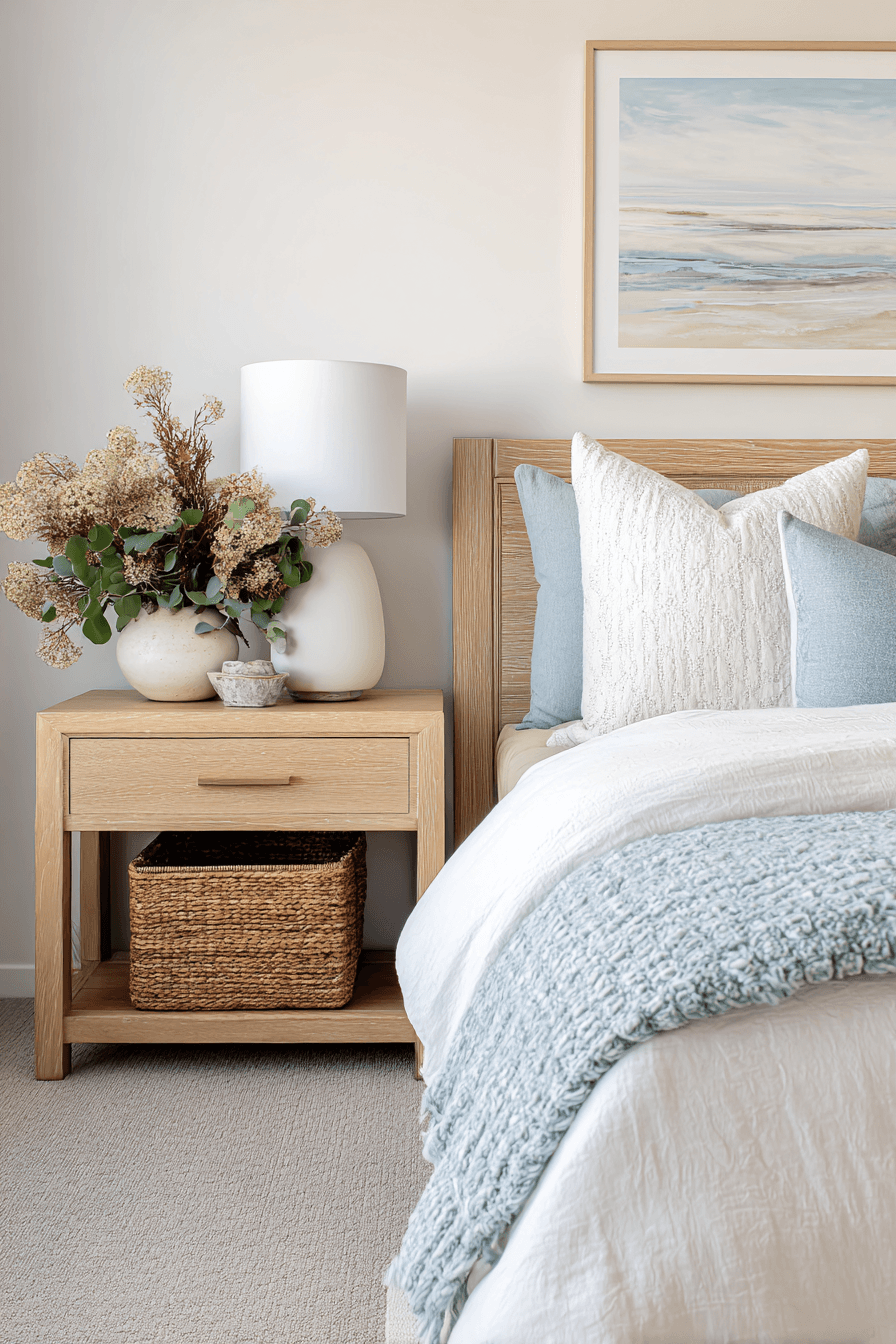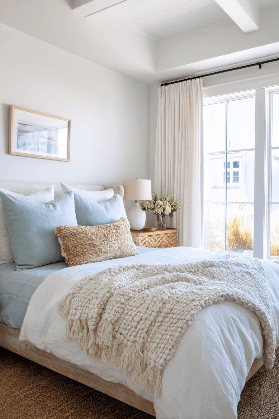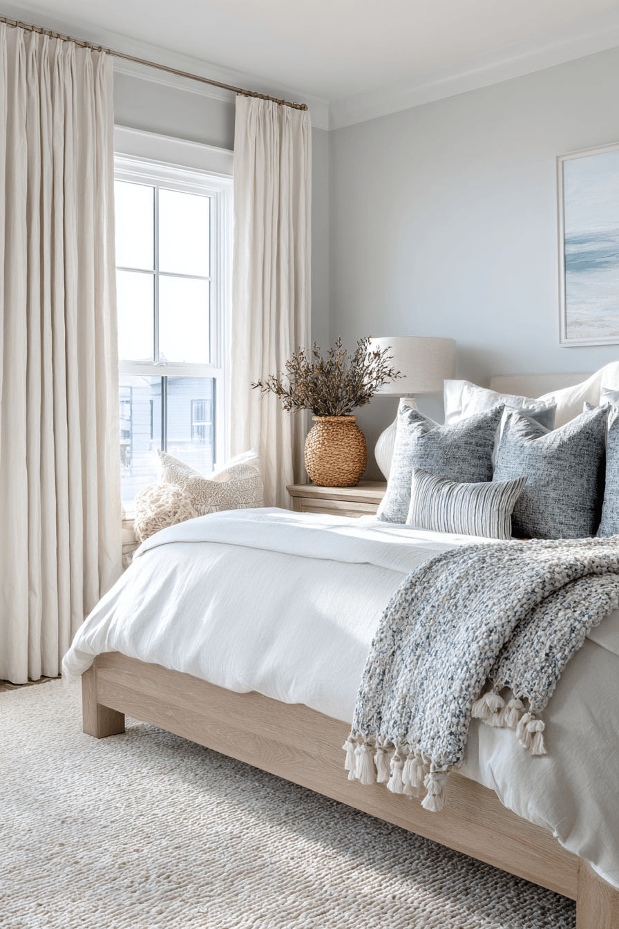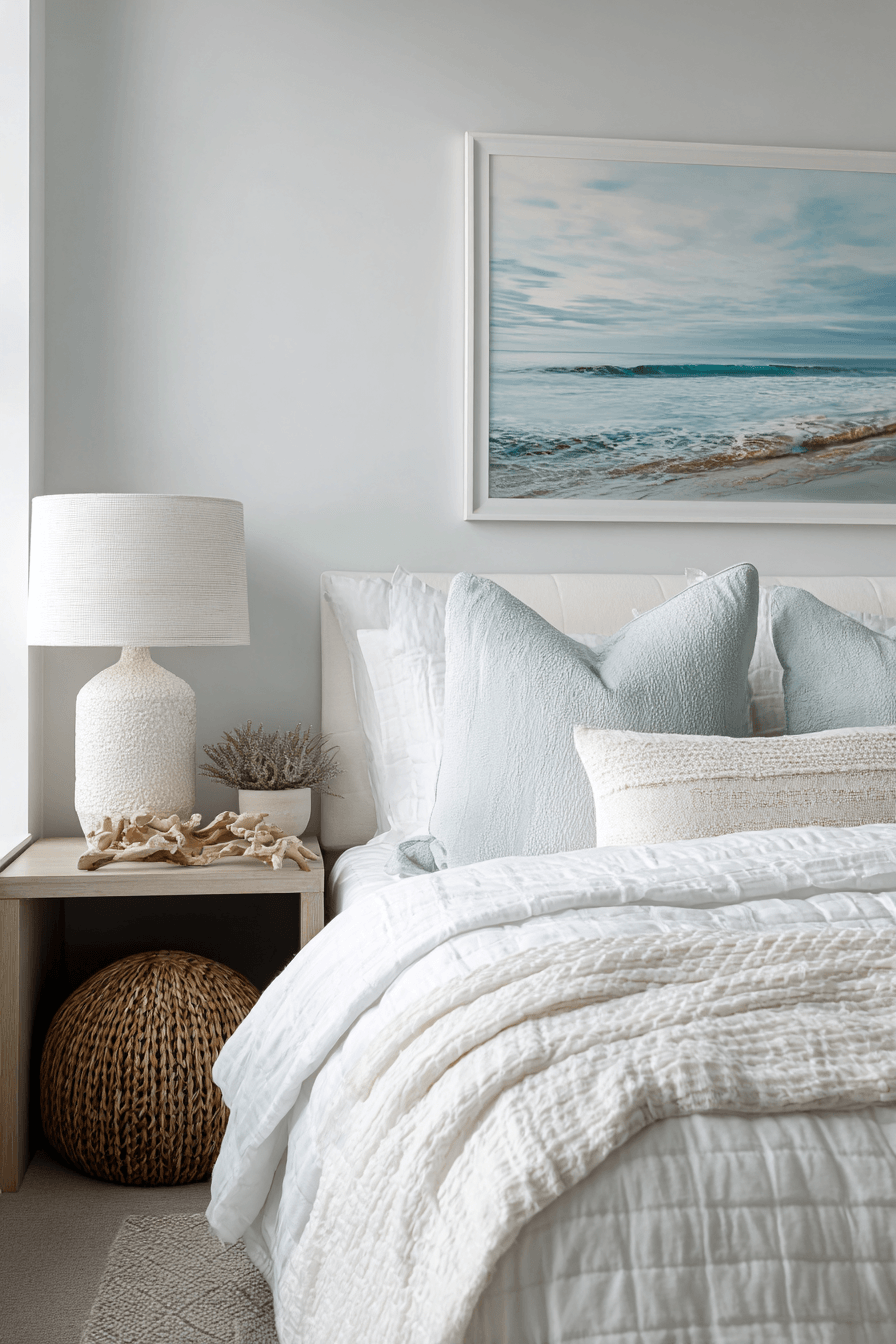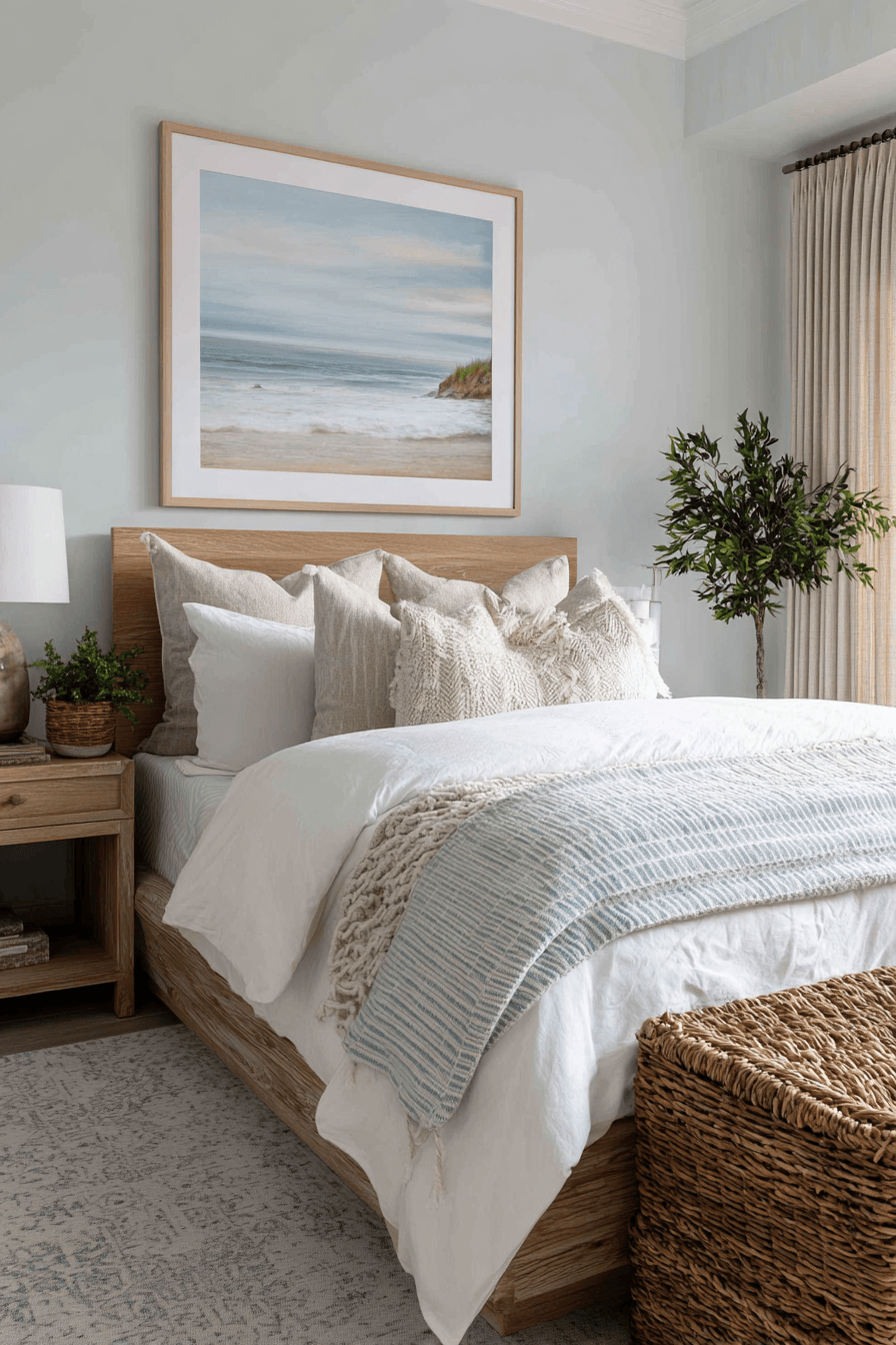 Soft neutrals and ocean accents define a coastal guest bedroom that feels both warm and refreshing. Layered bedding, textured throws, and subtle patterns create depth without adding clutter. Hints of navy, sea glass green, or sandy beige bring the coastal theme to life. The space feels thoughtfully styled, balancing comfort with a modern aesthetic. Light-enhancing finishes keep the room bright and inviting throughout the day. Small decorative touches like shells or driftwood frames add charm while maintaining simplicity. Click for more coastal bedroom styling ideas!