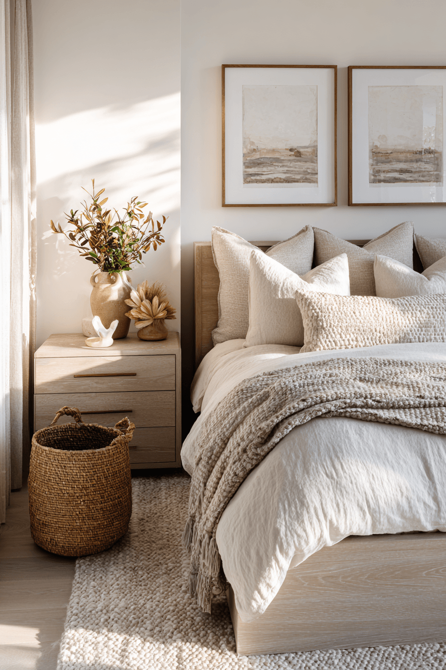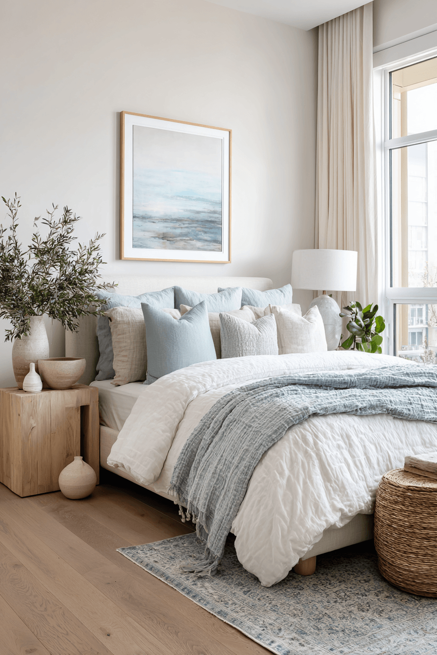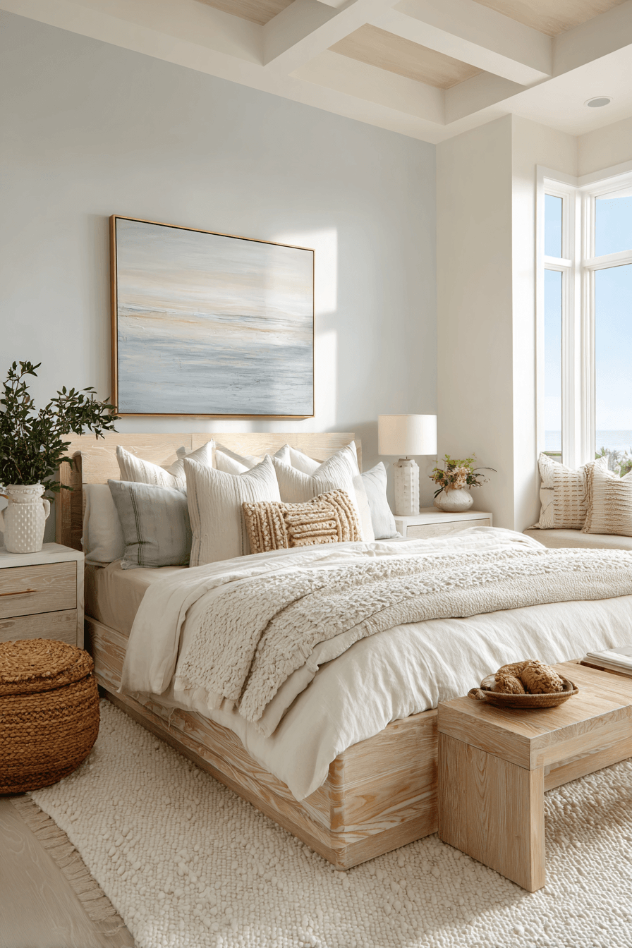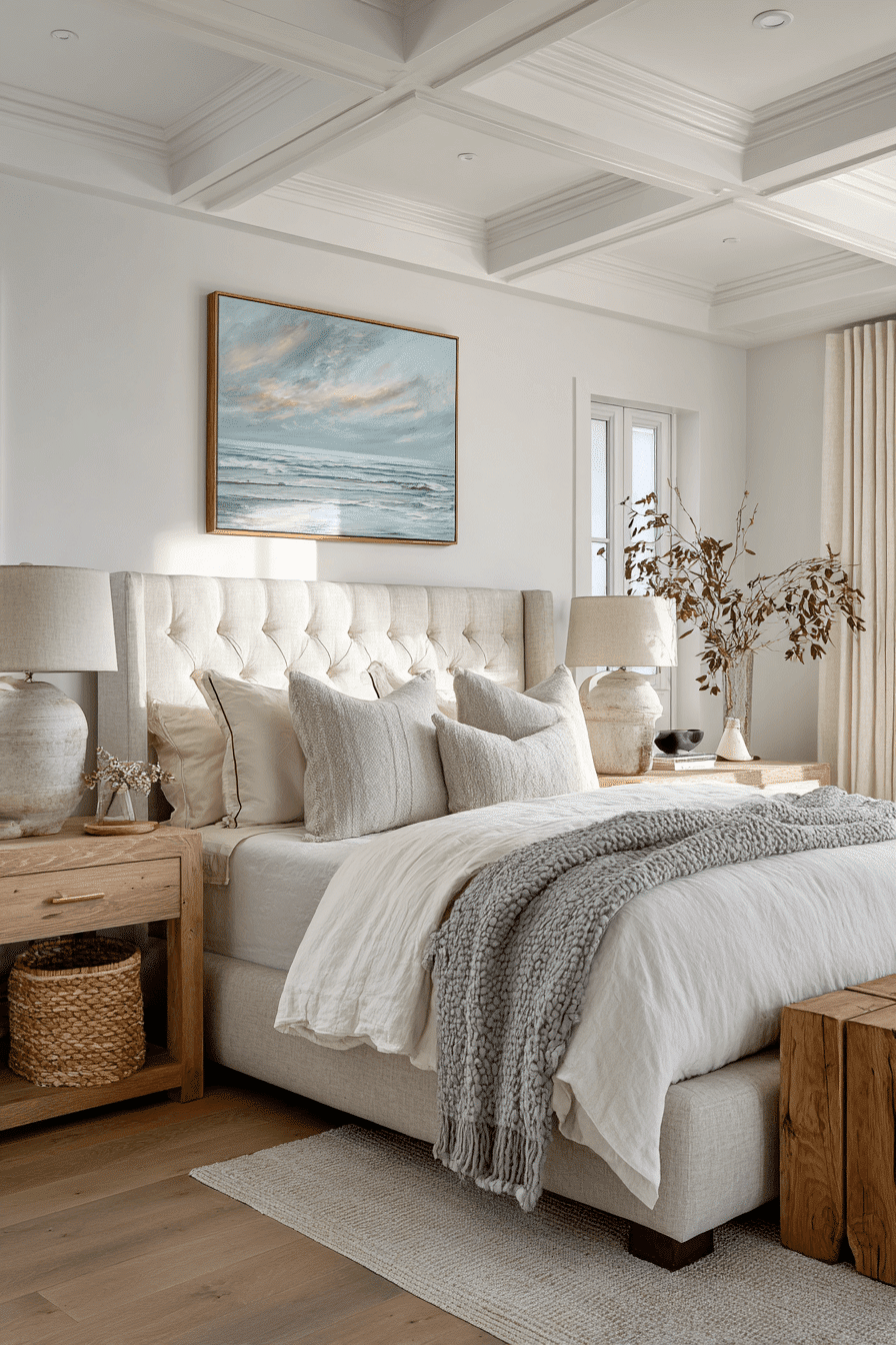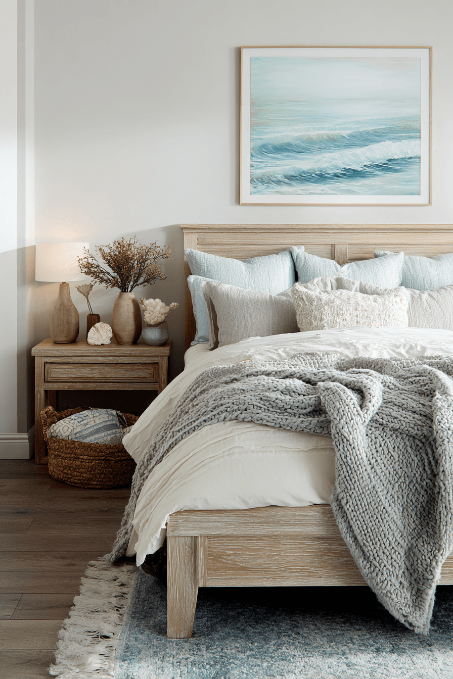 Soft neutrals and ocean accents define a coastal guest bedroom that feels both warm and refreshing. Layered bedding, textured throws, and subtle patterns create depth without adding clutter. Hints of navy, sea glass green, or sandy beige bring the coastal theme to life. The space feels thoughtfully styled, balancing comfort with a modern aesthetic. Light-enhancing finishes keep the room bright and inviting throughout the day. Small decorative touches like shells or driftwood frames add charm while maintaining simplicity. Click for more coastal bedroom styling ideas!