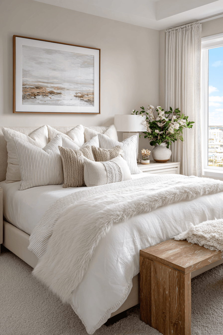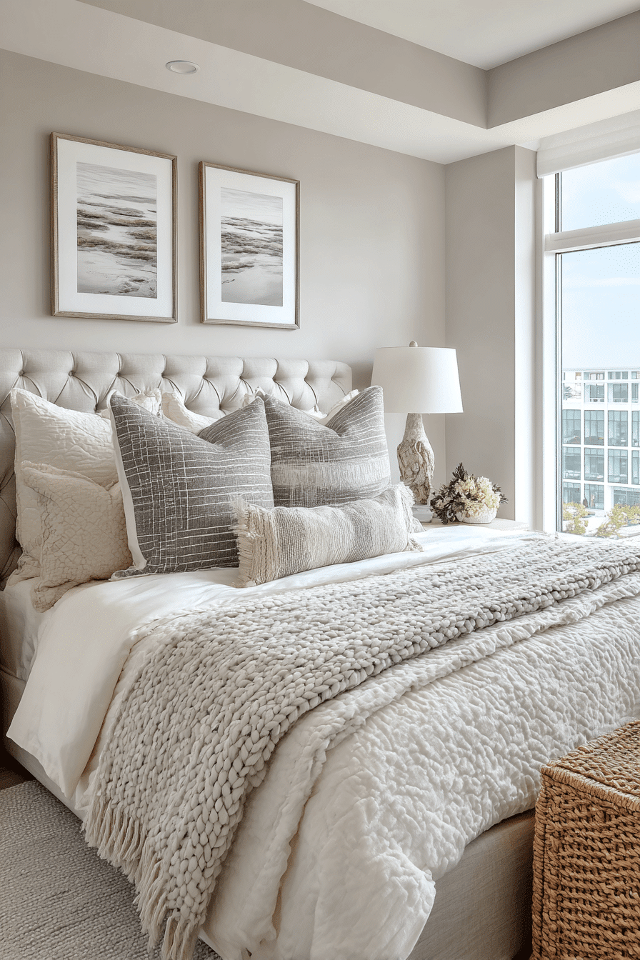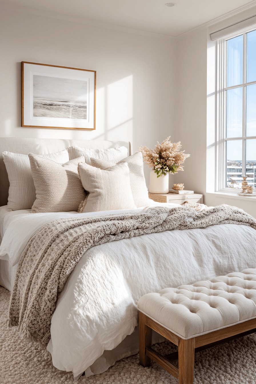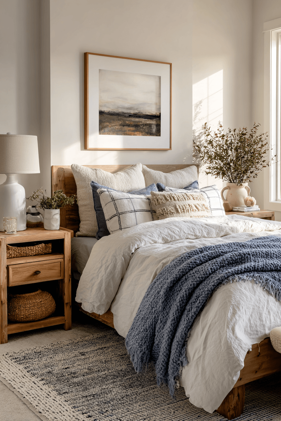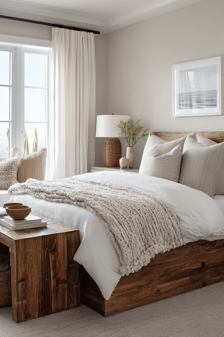Soft neutrals and ocean accents define a coastal guest bedroom that feels both warm and refreshing. Layered bedding, textured throws, and subtle patterns create depth without adding clutter. Hints of navy, sea glass green, or sandy beige bring the coastal theme to life. The space feels thoughtfully styled, balancing comfort with a modern aesthetic. Light-enhancing finishes keep the room bright and inviting throughout the day. Small decorative touches like shells or driftwood frames add charm while maintaining simplicity. Click for more coastal bedroom styling ideas!